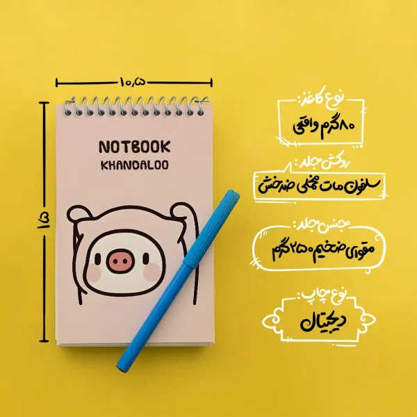 برند خندالو در زمینه تولید انواع دفاتر فانتزی و تحصیلی فعالیت میکند که به دلیل جذابیت ظاهری و طرح های متنوع طرفداران زیادی دارد. دفتر یادداشت خندالو طرح خوک بامزه محصولی مناسب برای همه عاشقان لوازم التحریر است و همچنین همه کسانی که بنا به موقعیت تحصیل یا شغلشان با دفتر و نوشت افزار زیاد سر و کار دارند. در تولید دفتر یادداشت خندالو طرح خوک بامزه از نوع صحافی فنر مارپیچ استفاده شده که در این نوع صحافی برگه‌ها به راحتی چرخیده و یا بیرون آورده می شوند.