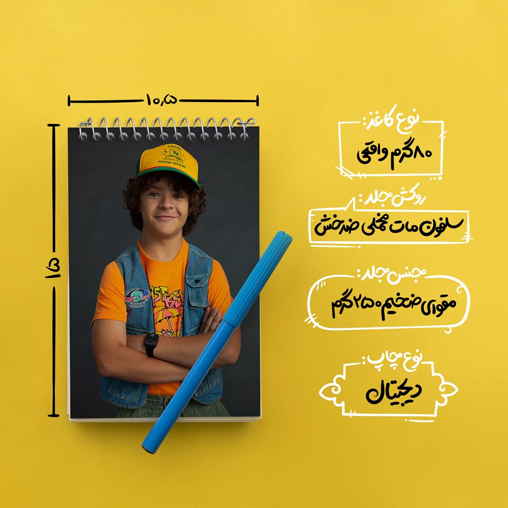 برند خندالو در زمینه تولید انواع دفاتر فانتزی و تحصیلی فعالیت میکند که به دلیل جذابیت ظاهری و طرح های متنوع طرفداران زیادی دارد. دفتر یادداشت خندالو طرح داستین سریال استرنجر تینگز Stranger Things محصولی مناسب برای همه عاشقان لوازم التحریر است و همچنین همه کسانی که بنا به موقعیت تحصیل یا شغلشان با دفتر و نوشت افزار زیاد سر و کار دارند. در تولید دفتر یادداشت خندالو طرح داستین سریال استرنجر تینگز Stranger Things از نوع صحافی فنر مارپیچ استفاده شده که در این نوع صحافی برگهها به راحتی چرخیده و یا بیرون آورده می شوند. دفتر های خندالو دارای جلد انعطاف پذیر از جنس مقوای گلاسه 250 گرم با روکش سلفون مات مخملی است که به شما امکان میدهد از دفتر خود بدون اینکه نگرانی از شکستن یا خراب شدن جلد را داشته باشید استفاده کنید و همچنین در این دفاتر از کاغذ 80 گرم با کیفیت استفاده شده که باعث میشود هنگام نوشتن به خوبی جوهر قلم بر روی صفحه نشسته و از خط خوردگیها جلوگیری کند. دفتر یادداشت خندالو با جنس و دوام مناسب، برگه های کاملاً سفید و خطوط طوسی دقیق را داراست که انسان را به نوشتن منظم و زیبا ترغیب میکند. طراحی کاملاً مناسب این دفاتر، به همراه کیفیت بالا، از آن یک محصول مورد علاقه و قابل اعتماد برای همه مقاطع تحصیلی میسازد. دفتر یادداشت خندالو طرح داستین سریال استرنجر تینگز Stranger Things انتخابی هوشمندانه و مناسب برای افرادی است که به دنبال دفتری با کیفیت و کاربرد عالی هستند. این دفتر، همراه خوبی برای شما در تمام مراحل تحصیل و کار خواهد بود و تجربهای لذتبخش از نوشتن و آموختن را به شما هدیه میدهد.