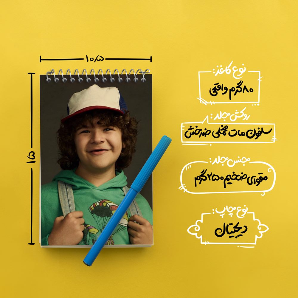 برند خندالو در زمینه تولید انواع دفاتر فانتزی و تحصیلی فعالیت میکند که به دلیل جذابیت ظاهری و طرح های متنوع طرفداران زیادی دارد. دفتر یادداشت خندالو طرح داستین سریال استرنجر تینگز Stranger Things محصولی مناسب برای همه عاشقان لوازم التحریر است و همچنین همه کسانی که بنا به موقعیت تحصیل یا شغلشان با دفتر و نوشت افزار زیاد سر و کار دارند. در تولید دفتر یادداشت خندالو طرح داستین سریال استرنجر تینگز Stranger Things از نوع صحافی فنر مارپیچ استفاده شده که در این نوع صحافی برگهها به راحتی چرخیده و یا بیرون آورده می شوند. دفتر های خندالو دارای جلد انعطاف پذیر از جنس مقوای گلاسه 250 گرم با روکش سلفون مات مخملی است که به شما امکان میدهد از دفتر خود بدون اینکه نگرانی از شکستن یا خراب شدن جلد را داشته باشید استفاده کنید و همچنین در این دفاتر از کاغذ 80 گرم با کیفیت استفاده شده که باعث میشود هنگام نوشتن به خوبی جوهر قلم بر روی صفحه نشسته و از خط خوردگیها جلوگیری کند. دفتر یادداشت خندالو با جنس و دوام مناسب، برگه های کاملاً سفید و خطوط طوسی دقیق را داراست که انسان را به نوشتن منظم و زیبا ترغیب میکند. طراحی کاملاً مناسب این دفاتر، به همراه کیفیت بالا، از آن یک محصول مورد علاقه و قابل اعتماد برای همه مقاطع تحصیلی میسازد. دفتر یادداشت خندالو طرح داستین سریال استرنجر تینگز Stranger Things انتخابی هوشمندانه و مناسب برای افرادی است که به دنبال دفتری با کیفیت و کاربرد عالی هستند. این دفتر، همراه خوبی برای شما در تمام مراحل تحصیل و کار خواهد بود و تجربهای لذتبخش از نوشتن و آموختن را به شما هدیه میدهد.