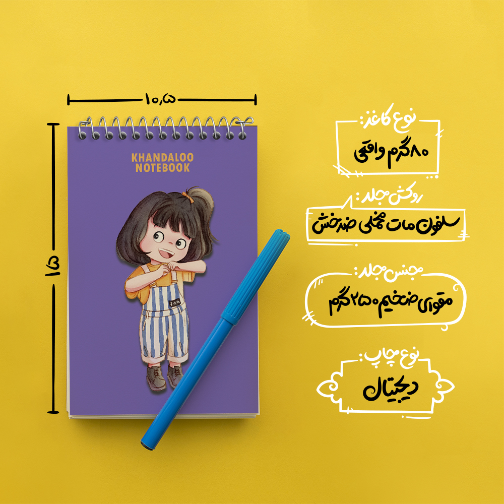 برند خندالو در زمینه تولید انواع دفاتر فانتزی و تحصیلی فعالیت میکند که به دلیل جذابیت ظاهری و طرح های متنوع طرفداران زیادی دارد. دفتر یادداشت خندالو طرح دخترانه بامزه محصولی مناسب برای همه عاشقان لوازم التحریر است و همچنین همه کسانی که بنا به موقعیت تحصیل یا شغلشان با دفتر و نوشت افزار زیاد سر و کار دارند. در تولید دفتر یادداشت خندالو طرح دخترانه بامزه از نوع صحافی فنر مارپیچ استفاده شده که در این نوع صحافی برگه‌ها به راحتی چرخیده و یا بیرون آورده می شوند.