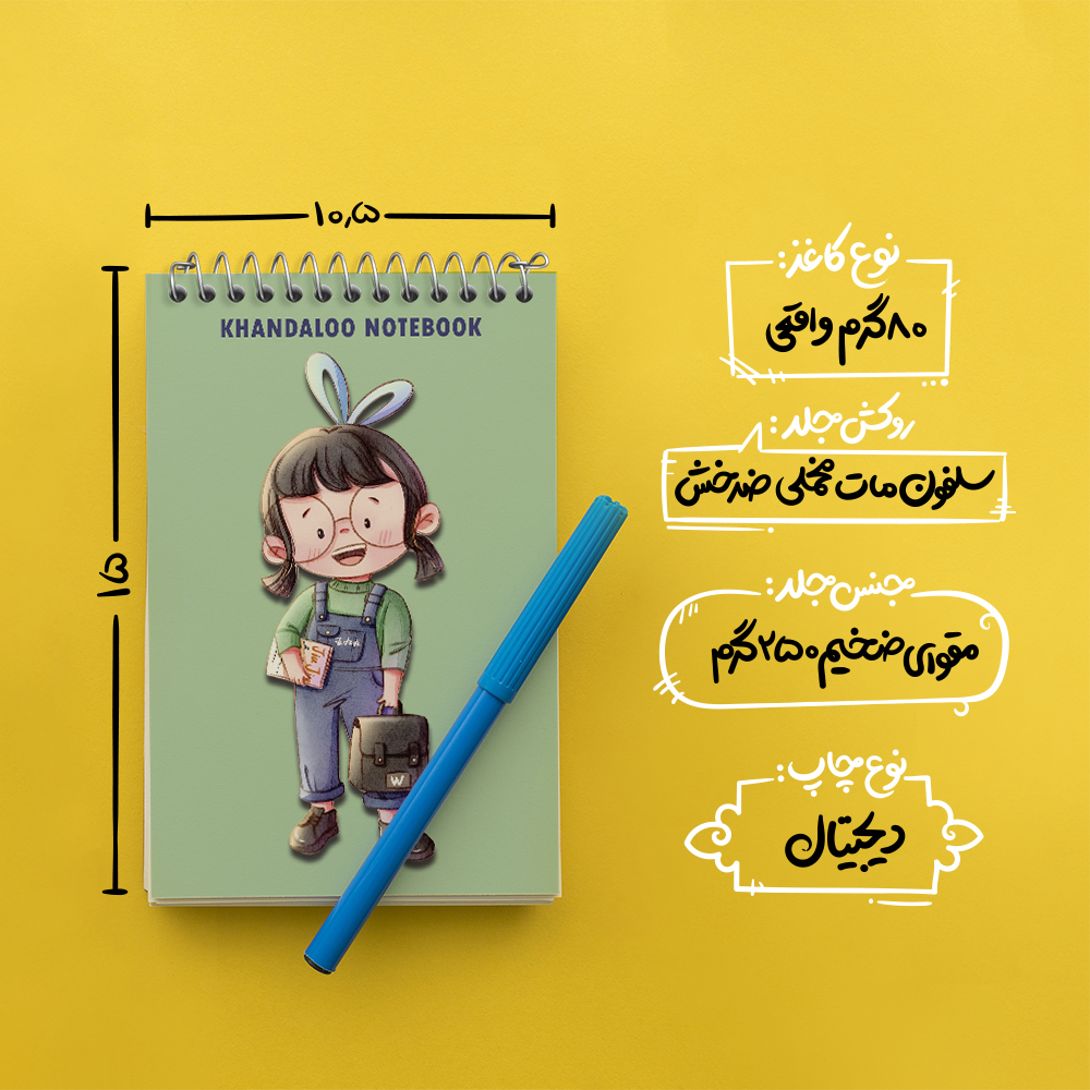 برند خندالو در زمینه تولید انواع دفاتر فانتزی و تحصیلی فعالیت میکند که به دلیل جذابیت ظاهری و طرح های متنوع طرفداران زیادی دارد. دفتر یادداشت خندالو طرح دخترانه بامزه محصولی مناسب برای همه عاشقان لوازم التحریر است و همچنین همه کسانی که بنا به موقعیت تحصیل یا شغلشان با دفتر و نوشت افزار زیاد سر و کار دارند. در تولید دفتر یادداشت خندالو طرح دخترانه بامزه از نوع صحافی فنر مارپیچ استفاده شده که در این نوع صحافی برگهها به راحتی چرخیده و یا بیرون آورده می شوند. دفتر های خندالو دارای جلد انعطاف پذیر از جنس مقوای گلاسه 250 گرم با روکش سلفون مات مخملی است که به شما امکان میدهد از دفتر خود بدون اینکه نگرانی از شکستن یا خراب شدن جلد را داشته باشید استفاده کنید و همچنین در این دفاتر از کاغذ 80 گرم با کیفیت استفاده شده که باعث میشود هنگام نوشتن به خوبی جوهر قلم بر روی صفحه نشسته و از خط خوردگیها جلوگیری کند. دفتر یادداشت خندالو با جنس و دوام مناسب، برگه های کاملاً سفید و خطوط طوسی دقیق را داراست که انسان را به نوشتن منظم و زیبا ترغیب میکند. طراحی کاملاً مناسب این دفاتر، به همراه کیفیت بالا، از آن یک محصول مورد علاقه و قابل اعتماد برای همه مقاطع تحصیلی میسازد. دفتر یادداشت خندالو طرح دخترانه بامزه انتخابی هوشمندانه و مناسب برای افرادی است که به دنبال دفتری با کیفیت و کاربرد عالی هستند. این دفتر، همراه خوبی برای شما در تمام مراحل تحصیل و کار خواهد بود و تجربهای لذتبخش از نوشتن و آموختن را به شما هدیه میدهد.