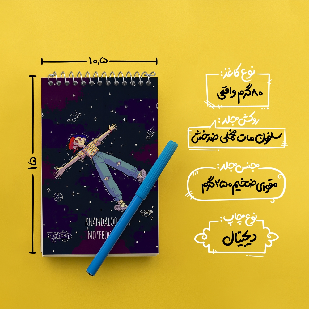 برند خندالو در زمینه تولید انواع دفاتر فانتزی و تحصیلی فعالیت میکند که به دلیل جذابیت ظاهری و طرح های متنوع طرفداران زیادی دارد. دفتر یادداشت خندالو طرح دخترانه فضایی محصولی مناسب برای همه عاشقان لوازم التحریر است و همچنین همه کسانی که بنا به موقعیت تحصیل یا شغلشان با دفتر و نوشت افزار زیاد سر و کار دارند. در تولید دفتر یادداشت خندالو طرح دخترانه فضایی از نوع صحافی فنر مارپیچ استفاده شده که در این نوع صحافی برگهها به راحتی چرخیده و یا بیرون آورده می شوند. دفتر های خندالو دارای جلد انعطاف پذیر از جنس مقوای گلاسه 250 گرم با روکش سلفون مات مخملی است که به شما امکان میدهد از دفتر خود بدون اینکه نگرانی از شکستن یا خراب شدن جلد را داشته باشید استفاده کنید و همچنین در این دفاتر از کاغذ 80 گرم با کیفیت استفاده شده که باعث میشود هنگام نوشتن به خوبی جوهر قلم بر روی صفحه نشسته و از خط خوردگیها جلوگیری کند. دفتر یادداشت خندالو با جنس و دوام مناسب، برگه های کاملاً سفید و خطوط طوسی دقیق را داراست که انسان را به نوشتن منظم و زیبا ترغیب میکند. طراحی کاملاً مناسب این دفاتر، به همراه کیفیت بالا، از آن یک محصول مورد علاقه و قابل اعتماد برای همه مقاطع تحصیلی میسازد. دفتر یادداشت خندالو طرح دخترانه فضایی انتخابی هوشمندانه و مناسب برای افرادی است که به دنبال دفتری با کیفیت و کاربرد عالی هستند. این دفتر، همراه خوبی برای شما در تمام مراحل تحصیل و کار خواهد بود و تجربهای لذتبخش از نوشتن و آموختن را به شما هدیه میدهد.