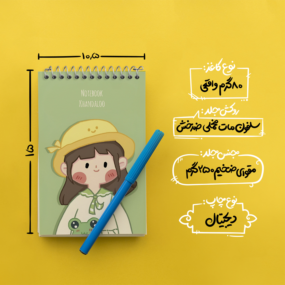 برند خندالو در زمینه تولید انواع دفاتر فانتزی و تحصیلی فعالیت میکند که به دلیل جذابیت ظاهری و طرح های متنوع طرفداران زیادی دارد. دفتر یادداشت خندالو طرح دخترانه کیوت محصولی مناسب برای همه عاشقان لوازم التحریر است و همچنین همه کسانی که بنا به موقعیت تحصیل یا شغلشان با دفتر و نوشت افزار زیاد سر و کار دارند. در تولید دفتر یادداشت خندالو طرح دخترانه کیوت از نوع صحافی فنر مارپیچ استفاده شده که در این نوع صحافی برگه‌ها به راحتی چرخیده و یا بیرون آورده می شوند.