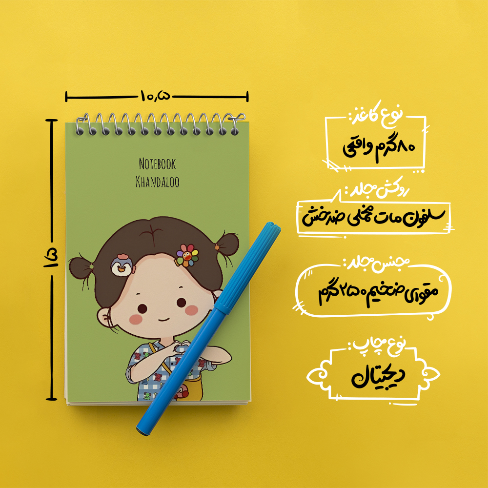 برند خندالو در زمینه تولید انواع دفاتر فانتزی و تحصیلی فعالیت میکند که به دلیل جذابیت ظاهری و طرح های متنوع طرفداران زیادی دارد. دفتر یادداشت خندالو طرح دخترانه کیوت محصولی مناسب برای همه عاشقان لوازم التحریر است و همچنین همه کسانی که بنا به موقعیت تحصیل یا شغلشان با دفتر و نوشت افزار زیاد سر و کار دارند. در تولید دفتر یادداشت خندالو طرح دخترانه کیوت از نوع صحافی فنر مارپیچ استفاده شده که در این نوع صحافی برگه‌ها به راحتی چرخیده و یا بیرون آورده می شوند.