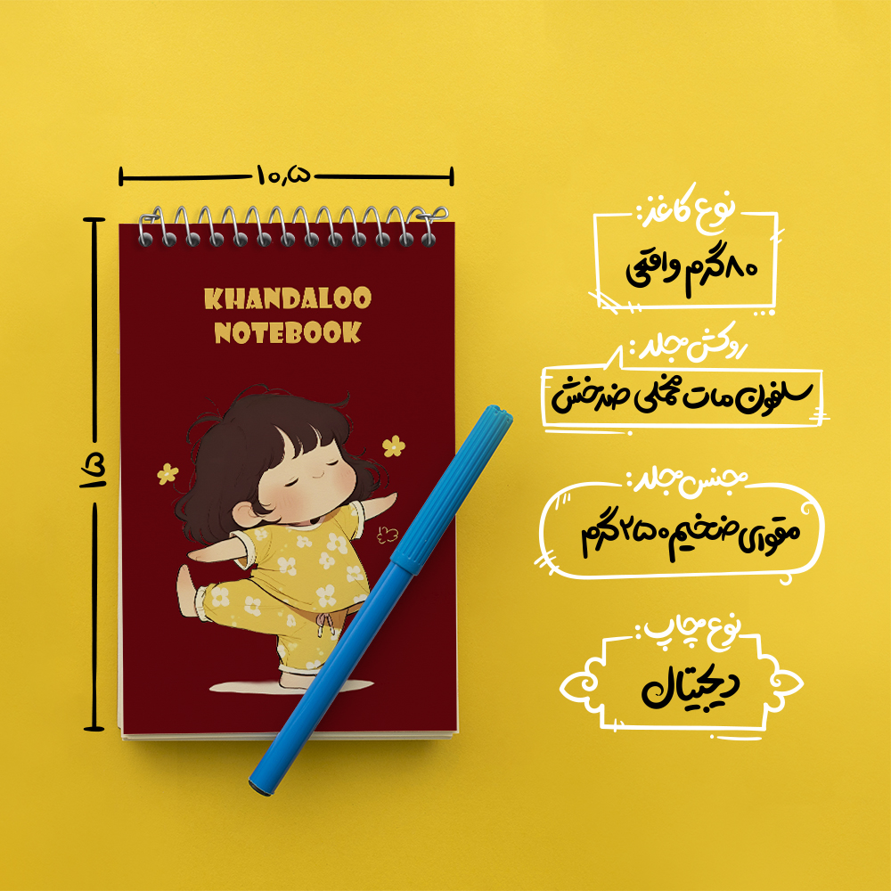 برند خندالو در زمینه تولید انواع دفاتر فانتزی و تحصیلی فعالیت میکند که به دلیل جذابیت ظاهری و طرح های متنوع طرفداران زیادی دارد. دفتر یادداشت خندالو طرح دخترانه کیوت محصولی مناسب برای همه عاشقان لوازم التحریر است و همچنین همه کسانی که بنا به موقعیت تحصیل یا شغلشان با دفتر و نوشت افزار زیاد سر و کار دارند. در تولید دفتر یادداشت خندالو طرح دخترانه کیوت از نوع صحافی فنر مارپیچ استفاده شده که در این نوع صحافی برگه‌ها به راحتی چرخیده و یا بیرون آورده می شوند.