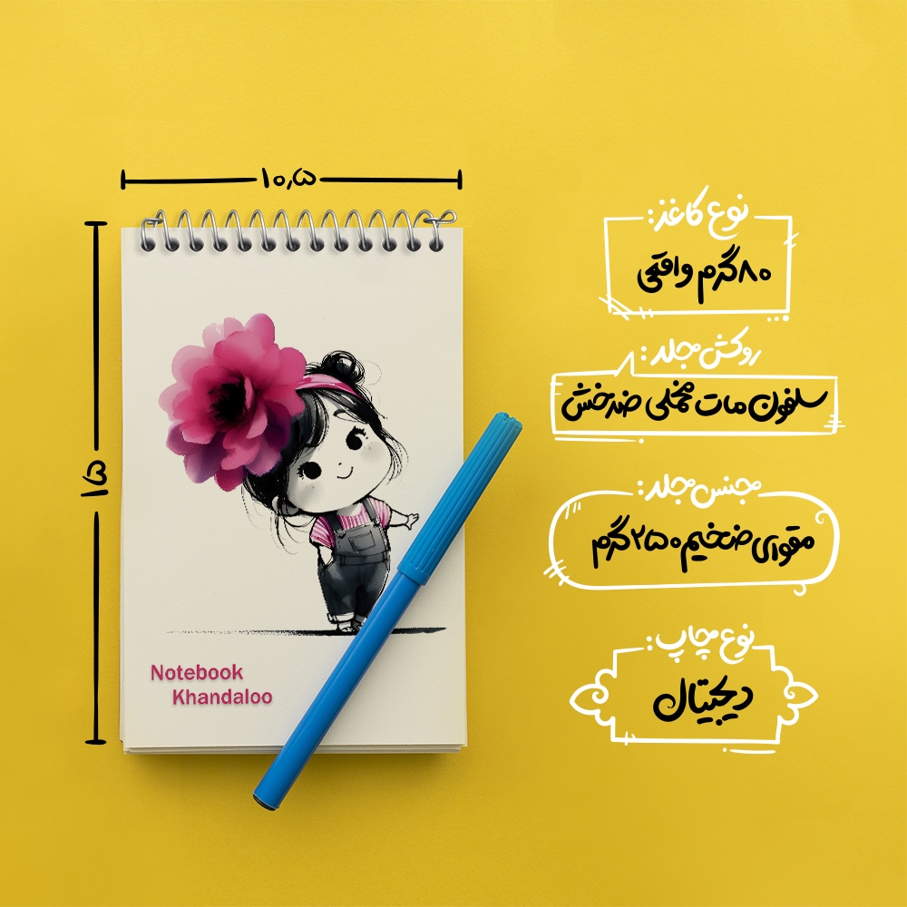 برند خندالو در زمینه تولید انواع دفاتر فانتزی و تحصیلی فعالیت میکند که به دلیل جذابیت ظاهری و طرح های متنوع طرفداران زیادی دارد. دفتر یادداشت خندالو طرح دخترانه کیوت محصولی مناسب برای همه عاشقان لوازم التحریر است و همچنین همه کسانی که بنا به موقعیت تحصیل یا شغلشان با دفتر و نوشت افزار زیاد سر و کار دارند. در تولید دفتر یادداشت خندالو طرح دخترانه کیوت از نوع صحافی فنر مارپیچ استفاده شده که در این نوع صحافی برگه‌ها به راحتی چرخیده و یا بیرون آورده می شوند.
