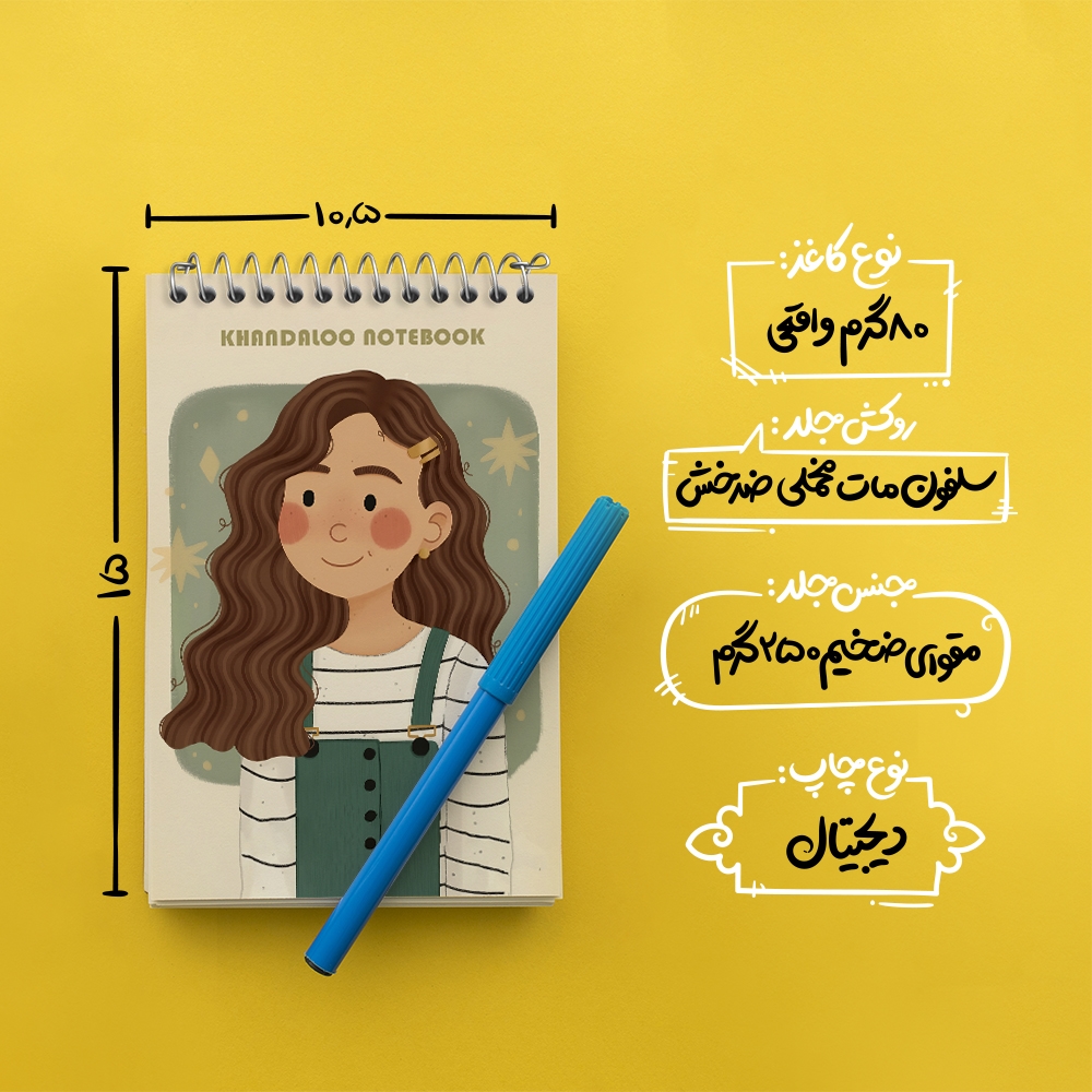 برند خندالو در زمینه تولید انواع دفاتر فانتزی و تحصیلی فعالیت میکند که به دلیل جذابیت ظاهری و طرح های متنوع طرفداران زیادی دارد. دفتر یادداشت خندالو طرح دخترانه محصولی مناسب برای همه عاشقان لوازم التحریر است و همچنین همه کسانی که بنا به موقعیت تحصیل یا شغلشان با دفتر و نوشت افزار زیاد سر و کار دارند. در تولید دفتر یادداشت خندالو طرح دخترانه از نوع صحافی فنر مارپیچ استفاده شده که در این نوع صحافی برگه‌ها به راحتی چرخیده و یا بیرون آورده می شوند.