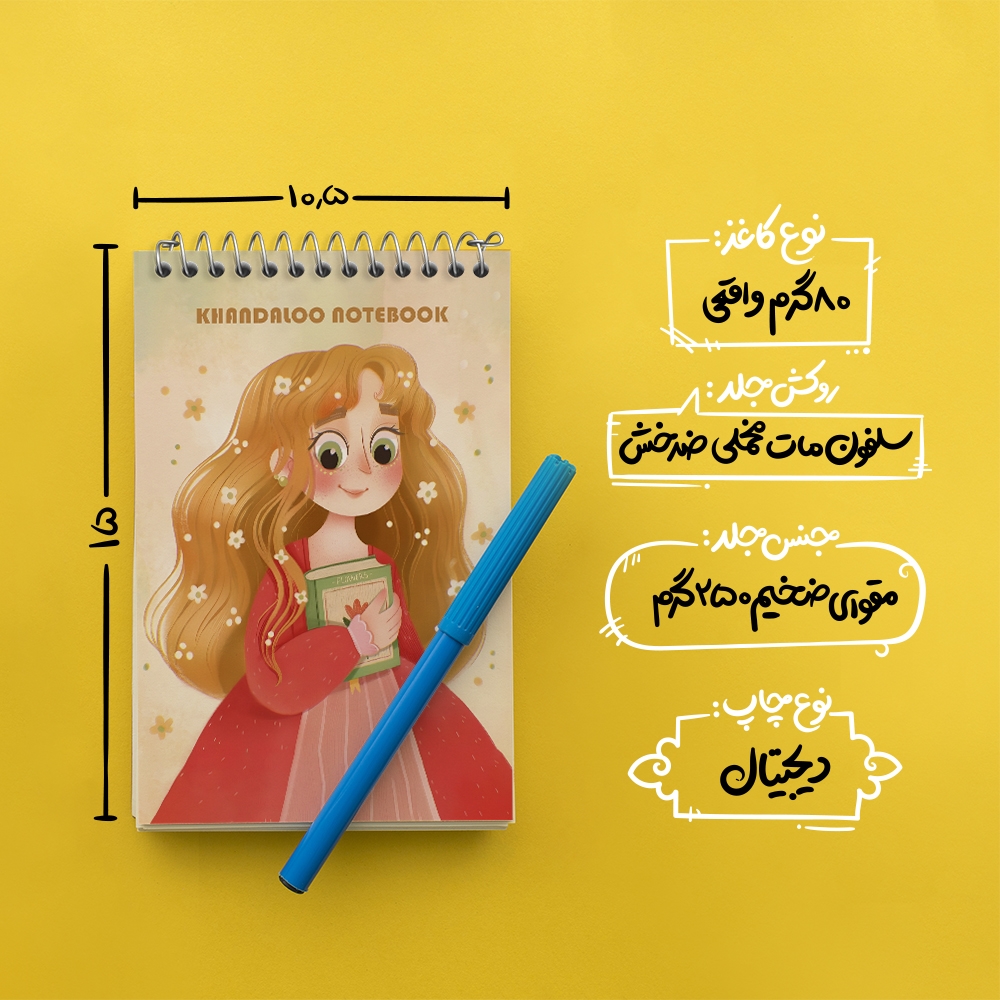 برند خندالو در زمینه تولید انواع دفاتر فانتزی و تحصیلی فعالیت میکند که به دلیل جذابیت ظاهری و طرح های متنوع طرفداران زیادی دارد. دفتر یادداشت خندالو طرح دخترانه محصولی مناسب برای همه عاشقان لوازم التحریر است و همچنین همه کسانی که بنا به موقعیت تحصیل یا شغلشان با دفتر و نوشت افزار زیاد سر و کار دارند. در تولید دفتر یادداشت خندالو طرح دخترانه از نوع صحافی فنر مارپیچ استفاده شده که در این نوع صحافی برگه‌ها به راحتی چرخیده و یا بیرون آورده می شوند.