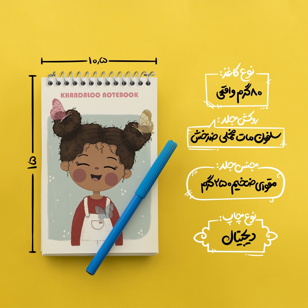 برند خندالو در زمینه تولید انواع دفاتر فانتزی و تحصیلی فعالیت میکند که به دلیل جذابیت ظاهری و طرح های متنوع طرفداران زیادی دارد. دفتر یادداشت خندالو طرح دختر خوشحال محصولی مناسب برای همه عاشقان لوازم التحریر است و همچنین همه کسانی که بنا به موقعیت تحصیل یا شغلشان با دفتر و نوشت افزار زیاد سر و کار دارند. در تولید دفتر یادداشت خندالو طرح دختر خوشحال از نوع صحافی فنر مارپیچ استفاده شده که در این نوع صحافی برگه‌ها به راحتی چرخیده و یا بیرون آورده می شوند.