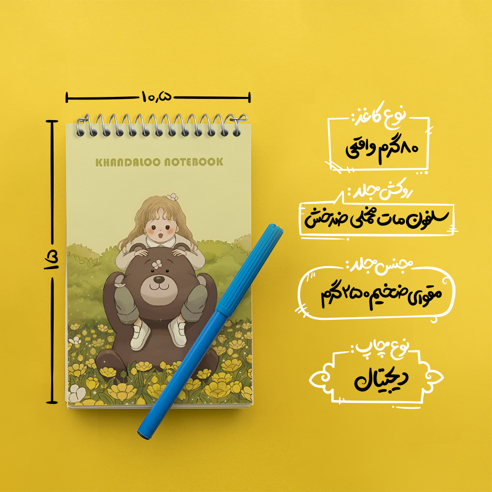 برند خندالو در زمینه تولید انواع دفاتر فانتزی و تحصیلی فعالیت میکند که به دلیل جذابیت ظاهری و طرح های متنوع طرفداران زیادی دارد. دفتر یادداشت خندالو طرح دختر و خرس محصولی مناسب برای همه عاشقان لوازم التحریر است و همچنین همه کسانی که بنا به موقعیت تحصیل یا شغلشان با دفتر و نوشت افزار زیاد سر و کار دارند. در تولید دفتر یادداشت خندالو طرح دختر و خرس از نوع صحافی فنر مارپیچ استفاده شده که در این نوع صحافی برگهها به راحتی چرخیده و یا بیرون آورده می شوند. دفتر های خندالو دارای جلد انعطاف پذیر از جنس مقوای گلاسه 250 گرم با روکش سلفون مات مخملی است که به شما امکان میدهد از دفتر خود بدون اینکه نگرانی از شکستن یا خراب شدن جلد را داشته باشید استفاده کنید و همچنین در این دفاتر از کاغذ 80 گرم با کیفیت استفاده شده که باعث میشود هنگام نوشتن به خوبی جوهر قلم بر روی صفحه نشسته و از خط خوردگیها جلوگیری کند. دفتر یادداشت خندالو با جنس و دوام مناسب، برگه های کاملاً سفید و خطوط طوسی دقیق را داراست که انسان را به نوشتن منظم و زیبا ترغیب میکند. طراحی کاملاً مناسب این دفاتر، به همراه کیفیت بالا، از آن یک محصول مورد علاقه و قابل اعتماد برای همه مقاطع تحصیلی میسازد. دفتر یادداشت خندالو طرح دختر و خرس انتخابی هوشمندانه و مناسب برای افرادی است که به دنبال دفتری با کیفیت و کاربرد عالی هستند. این دفتر، همراه خوبی برای شما در تمام مراحل تحصیل و کار خواهد بود و تجربهای لذتبخش از نوشتن و آموختن را به شما هدیه میدهد.