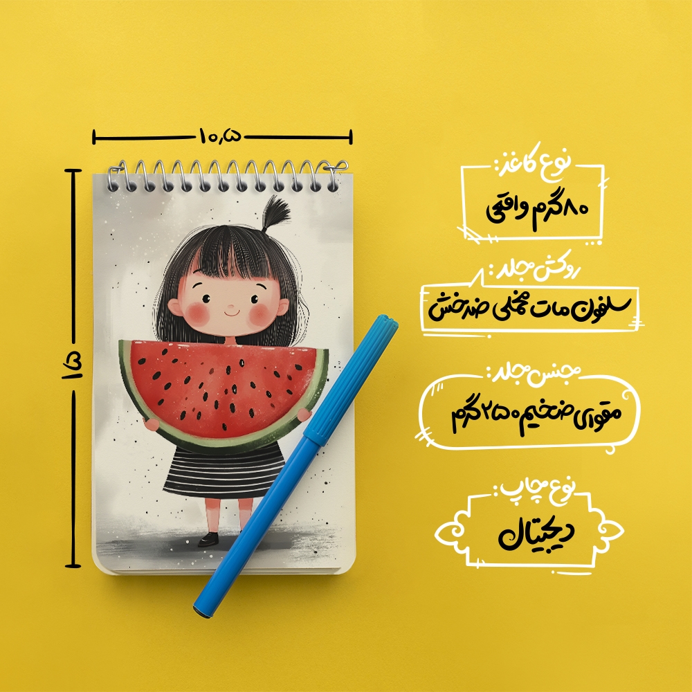 برند خندالو در زمینه تولید انواع دفاتر فانتزی و تحصیلی فعالیت میکند که به دلیل جذابیت ظاهری و طرح های متنوع طرفداران زیادی دارد. دفتر یادداشت خندالو طرح دختر و هندوانه محصولی مناسب برای همه عاشقان لوازم التحریر است و همچنین همه کسانی که بنا به موقعیت تحصیل یا شغلشان با دفتر و نوشت افزار زیاد سر و کار دارند. در تولید دفتر یادداشت خندالو طرح دختر و هندوانه از نوع صحافی فنر مارپیچ استفاده شده که در این نوع صحافی برگهها به راحتی چرخیده و یا بیرون آورده می شوند. دفتر های خندالو دارای جلد انعطاف پذیر از جنس مقوای گلاسه 250 گرم با روکش سلفون مات مخملی است که به شما امکان میدهد از دفتر خود بدون اینکه نگرانی از شکستن یا خراب شدن جلد را داشته باشید استفاده کنید و همچنین در این دفاتر از کاغذ 80 گرم با کیفیت استفاده شده که باعث میشود هنگام نوشتن به خوبی جوهر قلم بر روی صفحه نشسته و از خط خوردگیها جلوگیری کند. دفتر یادداشت خندالو با جنس و دوام مناسب، برگه های کاملاً سفید و خطوط طوسی دقیق را داراست که انسان را به نوشتن منظم و زیبا ترغیب میکند. طراحی کاملاً مناسب این دفاتر، به همراه کیفیت بالا، از آن یک محصول مورد علاقه و قابل اعتماد برای همه مقاطع تحصیلی میسازد. دفتر یادداشت خندالو طرح دختر و هندوانه انتخابی هوشمندانه و مناسب برای افرادی است که به دنبال دفتری با کیفیت و کاربرد عالی هستند. این دفتر، همراه خوبی برای شما در تمام مراحل تحصیل و کار خواهد بود و تجربهای لذتبخش از نوشتن و آموختن را به شما هدیه میدهد.