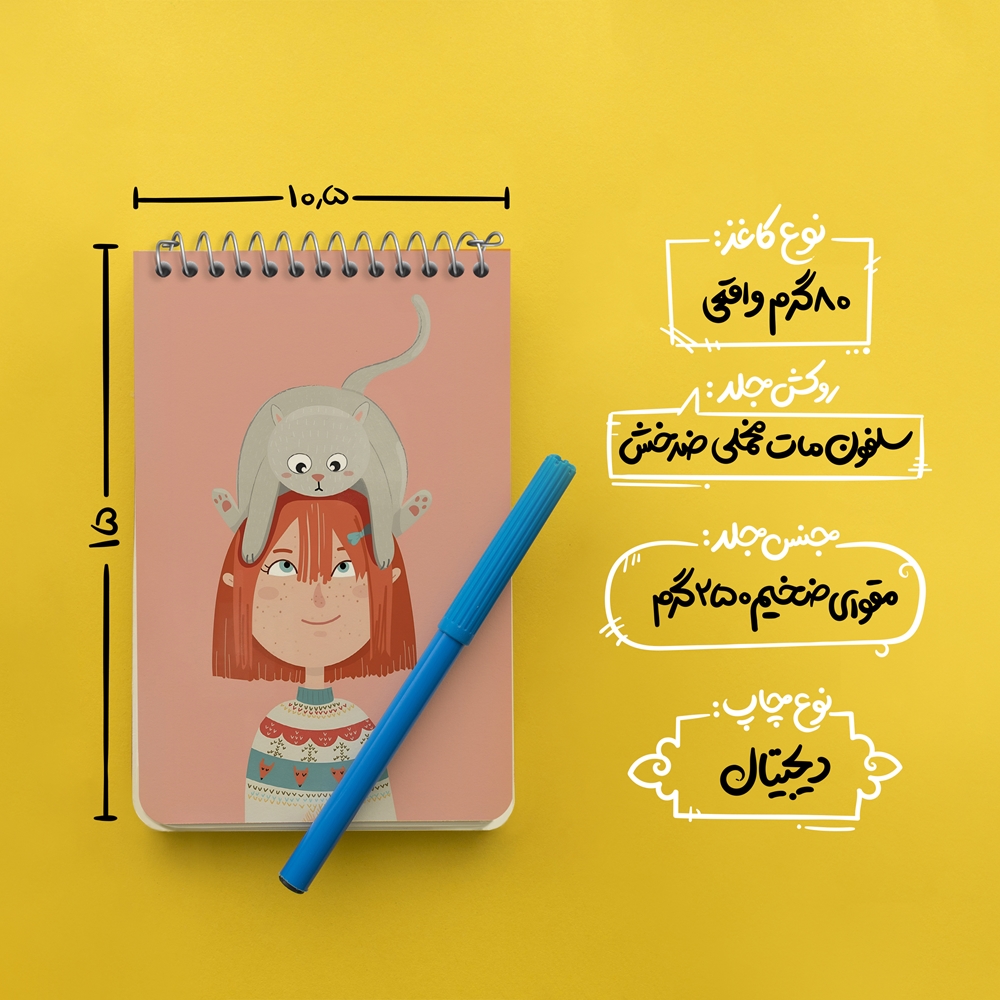 برند خندالو در زمینه تولید انواع دفاتر فانتزی و تحصیلی فعالیت میکند که به دلیل جذابیت ظاهری و طرح های متنوع طرفداران زیادی دارد. دفتر یادداشت خندالو طرح دختر و گربه محصولی مناسب برای همه عاشقان لوازم التحریر است و همچنین همه کسانی که بنا به موقعیت تحصیل یا شغلشان با دفتر و نوشت افزار زیاد سر و کار دارند. در تولید دفتر یادداشت خندالو طرح دختر و گربه از نوع صحافی فنر مارپیچ استفاده شده که در این نوع صحافی برگه‌ها به راحتی چرخیده و یا بیرون آورده می شوند.