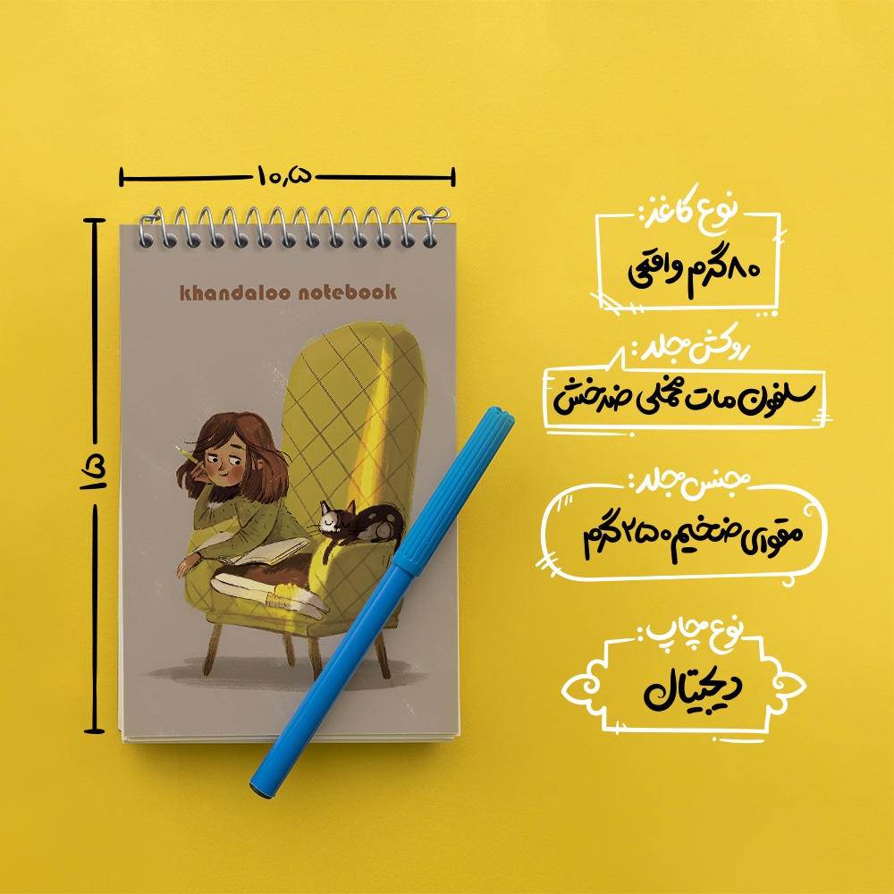برند خندالو در زمینه تولید انواع دفاتر فانتزی و تحصیلی فعالیت میکند که به دلیل جذابیت ظاهری و طرح های متنوع طرفداران زیادی دارد. دفتر یادداشت خندالو طرح دختر و گربه محصولی مناسب برای همه عاشقان لوازم التحریر است و همچنین همه کسانی که بنا به موقعیت تحصیل یا شغلشان با دفتر و نوشت افزار زیاد سر و کار دارند. در تولید دفتر یادداشت خندالو طرح دختر و گربه از نوع صحافی فنر مارپیچ استفاده شده که در این نوع صحافی برگه‌ها به راحتی چرخیده و یا بیرون آورده می شوند.