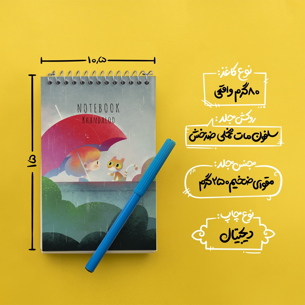 برند خندالو در زمینه تولید انواع دفاتر فانتزی و تحصیلی فعالیت میکند که به دلیل جذابیت ظاهری و طرح های متنوع طرفداران زیادی دارد. دفتر یادداشت خندالو طرح دختر و گربه محصولی مناسب برای همه عاشقان لوازم التحریر است و همچنین همه کسانی که بنا به موقعیت تحصیل یا شغلشان با دفتر و نوشت افزار زیاد سر و کار دارند. در تولید دفتر یادداشت خندالو طرح دختر و گربه از نوع صحافی فنر مارپیچ استفاده شده که در این نوع صحافی برگه‌ها به راحتی چرخیده و یا بیرون آورده می شوند.