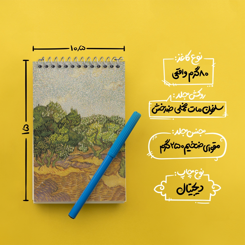 برند خندالو در زمینه تولید انواع دفاتر فانتزی و تحصیلی فعالیت میکند که به دلیل جذابیت ظاهری و طرح های متنوع طرفداران زیادی دارد. دفتر یادداشت خندالو طرح درختان زیتون ونسان ونگوگ (Van Gogh) محصولی مناسب برای همه عاشقان لوازم التحریر است و همچنین همه کسانی که بنا به موقعیت تحصیل یا شغلشان با دفتر و نوشت افزار زیاد سر و کار دارند. در تولید دفتر یادداشت خندالو طرح درختان زیتون ونسان ونگوگ (Van Gogh) از نوع صحافی فنر مارپیچ استفاده شده که در این نوع صحافی برگهها به راحتی چرخیده و یا بیرون آورده می شوند. دفتر های خندالو دارای جلد انعطاف پذیر از جنس مقوای گلاسه 250 گرم با روکش سلفون مات مخملی است که به شما امکان میدهد از دفتر خود بدون اینکه نگرانی از شکستن یا خراب شدن جلد را داشته باشید استفاده کنید و همچنین در این دفاتر از کاغذ 80 گرم با کیفیت استفاده شده که باعث میشود هنگام نوشتن به خوبی جوهر قلم بر روی صفحه نشسته و از خط خوردگیها جلوگیری کند. دفتر یادداشت خندالو با جنس و دوام مناسب، برگه های کاملاً سفید و خطوط طوسی دقیق را داراست که انسان را به نوشتن منظم و زیبا ترغیب میکند. طراحی کاملاً مناسب این دفاتر، به همراه کیفیت بالا، از آن یک محصول مورد علاقه و قابل اعتماد برای همه مقاطع تحصیلی میسازد. دفتر یادداشت خندالو طرح درختان زیتون ونسان ونگوگ (Van Gogh) انتخابی هوشمندانه و مناسب برای افرادی است که به دنبال دفتری با کیفیت و کاربرد عالی هستند. این دفتر، همراه خوبی برای شما در تمام مراحل تحصیل و کار خواهد بود و تجربهای لذتبخش از نوشتن و آموختن را به شما هدیه میدهد.