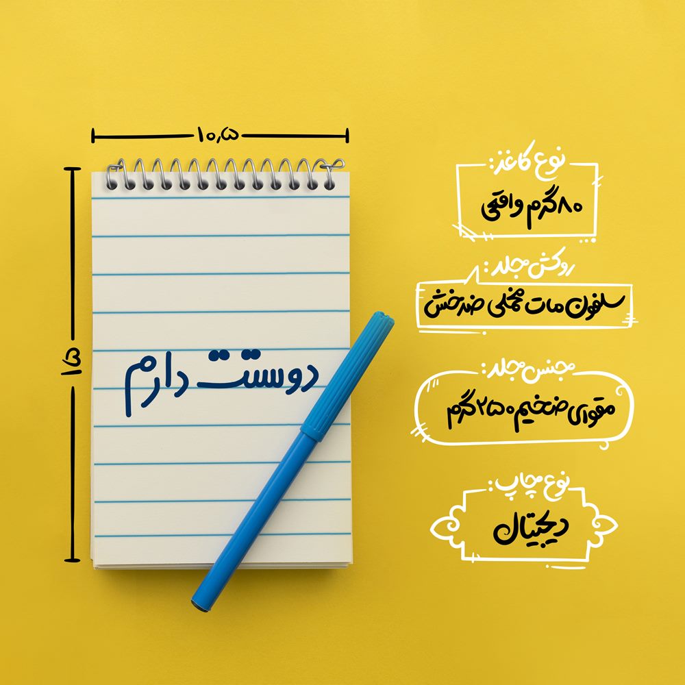 برند خندالو در زمینه تولید انواع دفاتر فانتزی و تحصیلی فعالیت میکند که به دلیل جذابیت ظاهری و طرح های متنوع طرفداران زیادی دارد. دفتر یادداشت خندالو طرح دوستت دارم محصولی مناسب برای همه عاشقان لوازم التحریر است و همچنین همه کسانی که بنا به موقعیت تحصیل یا شغلشان با دفتر و نوشت افزار زیاد سر و کار دارند. در تولید دفتر یادداشت خندالو طرح دوستت دارم از نوع صحافی فنر مارپیچ استفاده شده که در این نوع صحافی برگهها به راحتی چرخیده و یا بیرون آورده می شوند. دفتر های خندالو دارای جلد انعطاف پذیر از جنس مقوای گلاسه 250 گرم با روکش سلفون مات مخملی است که به شما امکان میدهد از دفتر خود بدون اینکه نگرانی از شکستن یا خراب شدن جلد را داشته باشید استفاده کنید و همچنین در این دفاتر از کاغذ 80 گرم با کیفیت استفاده شده که باعث میشود هنگام نوشتن به خوبی جوهر قلم بر روی صفحه نشسته و از خط خوردگیها جلوگیری کند. دفتر یادداشت خندالو با جنس و دوام مناسب، برگه های کاملاً سفید و خطوط طوسی دقیق را داراست که انسان را به نوشتن منظم و زیبا ترغیب میکند. طراحی کاملاً مناسب این دفاتر، به همراه کیفیت بالا، از آن یک محصول مورد علاقه و قابل اعتماد برای همه مقاطع تحصیلی میسازد. دفتر یادداشت خندالو طرح دوستت دارم انتخابی هوشمندانه و مناسب برای افرادی است که به دنبال دفتری با کیفیت و کاربرد عالی هستند. این دفتر، همراه خوبی برای شما در تمام مراحل تحصیل و کار خواهد بود و تجربهای لذتبخش از نوشتن و آموختن را به شما هدیه میدهد.