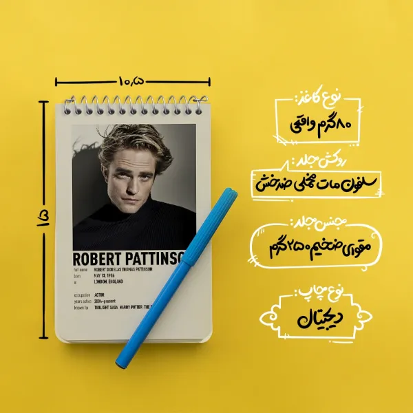 برند خندالو در زمینه تولید انواع دفاتر فانتزی و تحصیلی فعالیت میکند که به دلیل جذابیت ظاهری و طرح های متنوع طرفداران زیادی دارد. دفتر یادداشت خندالو طرح رابرت پتینسون (Robert Pattinson) محصولی مناسب برای همه عاشقان لوازم التحریر است و همچنین همه کسانی که بنا به موقعیت تحصیل یا شغلشان با دفتر و نوشت افزار زیاد سر و کار دارند. در تولید دفتر یادداشت خندالو طرح رابرت پتینسون (Robert Pattinson) از نوع صحافی فنر مارپیچ استفاده شده که در این نوع صحافی برگهها به راحتی چرخیده و یا بیرون آورده می شوند. دفتر های خندالو دارای جلد انعطاف پذیر از جنس مقوای گلاسه 250 گرم با روکش سلفون مات مخملی است که به شما امکان میدهد از دفتر خود بدون اینکه نگرانی از شکستن یا خراب شدن جلد را داشته باشید استفاده کنید و همچنین در این دفاتر از کاغذ 80 گرم با کیفیت استفاده شده که باعث میشود هنگام نوشتن به خوبی جوهر قلم بر روی صفحه نشسته و از خط خوردگیها جلوگیری کند. دفتر یادداشت خندالو با جنس و دوام مناسب، برگه های کاملاً سفید و خطوط طوسی دقیق را داراست که انسان را به نوشتن منظم و زیبا ترغیب میکند. طراحی کاملاً مناسب این دفاتر، به همراه کیفیت بالا، از آن یک محصول مورد علاقه و قابل اعتماد برای همه مقاطع تحصیلی میسازد. دفتر یادداشت خندالو طرح رابرت پتینسون (Robert Pattinson) انتخابی هوشمندانه و مناسب برای افرادی است که به دنبال دفتری با کیفیت و کاربرد عالی هستند. این دفتر، همراه خوبی برای شما در تمام مراحل تحصیل و کار خواهد بود و تجربهای لذتبخش از نوشتن و آموختن را به شما هدیه میدهد.