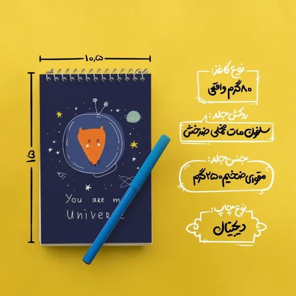 برند خندالو در زمینه تولید انواع دفاتر فانتزی و تحصیلی فعالیت میکند که به دلیل جذابیت ظاهری و طرح های متنوع طرفداران زیادی دارد. دفتر یادداشت خندالو طرح روباه فضایی محصولی مناسب برای همه عاشقان لوازم التحریر است و همچنین همه کسانی که بنا به موقعیت تحصیل یا شغلشان با دفتر و نوشت افزار زیاد سر و کار دارند. در تولید دفتر یادداشت خندالو طرح روباه فضایی از نوع صحافی فنر مارپیچ استفاده شده که در این نوع صحافی برگهها به راحتی چرخیده و یا بیرون آورده می شوند. دفتر های خندالو دارای جلد انعطاف پذیر از جنس مقوای گلاسه 250 گرم با روکش سلفون مات مخملی است که به شما امکان میدهد از دفتر خود بدون اینکه نگرانی از شکستن یا خراب شدن جلد را داشته باشید استفاده کنید و همچنین در این دفاتر از کاغذ 80 گرم با کیفیت استفاده شده که باعث میشود هنگام نوشتن به خوبی جوهر قلم بر روی صفحه نشسته و از خط خوردگیها جلوگیری کند. دفتر یادداشت خندالو با جنس و دوام مناسب، برگه های کاملاً سفید و خطوط طوسی دقیق را داراست که انسان را به نوشتن منظم و زیبا ترغیب میکند. طراحی کاملاً مناسب این دفاتر، به همراه کیفیت بالا، از آن یک محصول مورد علاقه و قابل اعتماد برای همه مقاطع تحصیلی میسازد. دفتر یادداشت خندالو طرح روباه فضایی انتخابی هوشمندانه و مناسب برای افرادی است که به دنبال دفتری با کیفیت و کاربرد عالی هستند. این دفتر، همراه خوبی برای شما در تمام مراحل تحصیل و کار خواهد بود و تجربهای لذتبخش از نوشتن و آموختن را به شما هدیه میدهد.