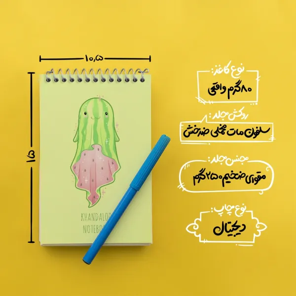 برند خندالو در زمینه تولید انواع دفاتر فانتزی و تحصیلی فعالیت میکند که به دلیل جذابیت ظاهری و طرح های متنوع طرفداران زیادی دارد. دفتر یادداشت خندالو طرح روح هندوانه ای بامزه محصولی مناسب برای همه عاشقان لوازم التحریر است و همچنین همه کسانی که بنا به موقعیت تحصیل یا شغلشان با دفتر و نوشت افزار زیاد سر و کار دارند. در تولید دفتر یادداشت خندالو طرح روح هندوانه ای بامزه از نوع صحافی فنر مارپیچ استفاده شده که در این نوع صحافی برگهها به راحتی چرخیده و یا بیرون آورده می شوند. دفتر های خندالو دارای جلد انعطاف پذیر از جنس مقوای گلاسه 250 گرم با روکش سلفون مات مخملی است که به شما امکان میدهد از دفتر خود بدون اینکه نگرانی از شکستن یا خراب شدن جلد را داشته باشید استفاده کنید و همچنین در این دفاتر از کاغذ 80 گرم با کیفیت استفاده شده که باعث میشود هنگام نوشتن به خوبی جوهر قلم بر روی صفحه نشسته و از خط خوردگیها جلوگیری کند. دفتر یادداشت خندالو با جنس و دوام مناسب، برگه های کاملاً سفید و خطوط طوسی دقیق را داراست که انسان را به نوشتن منظم و زیبا ترغیب میکند. طراحی کاملاً مناسب این دفاتر، به همراه کیفیت بالا، از آن یک محصول مورد علاقه و قابل اعتماد برای همه مقاطع تحصیلی میسازد. دفتر یادداشت خندالو طرح روح هندوانه ای بامزه انتخابی هوشمندانه و مناسب برای افرادی است که به دنبال دفتری با کیفیت و کاربرد عالی هستند. این دفتر، همراه خوبی برای شما در تمام مراحل تحصیل و کار خواهد بود و تجربهای لذتبخش از نوشتن و آموختن را به شما هدیه میدهد.