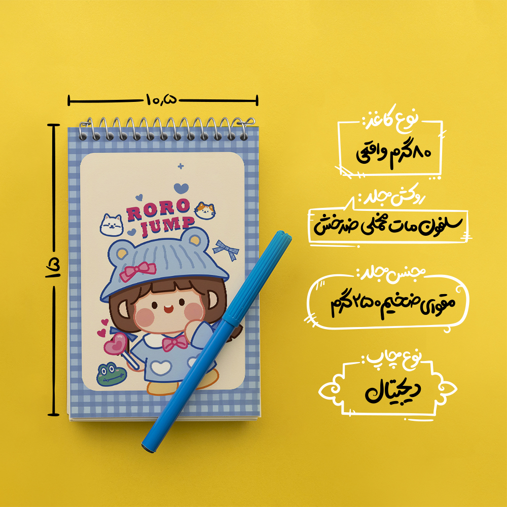 برند خندالو در زمینه تولید انواع دفاتر فانتزی و تحصیلی فعالیت میکند که به دلیل جذابیت ظاهری و طرح های متنوع طرفداران زیادی دارد. دفتر یادداشت خندالو طرح رورو جامپ کیوت محصولی مناسب برای همه عاشقان لوازم التحریر است و همچنین همه کسانی که بنا به موقعیت تحصیل یا شغلشان با دفتر و نوشت افزار زیاد سر و کار دارند. در تولید دفتر یادداشت خندالو طرح رورو جامپ کیوت از نوع صحافی فنر مارپیچ استفاده شده که در این نوع صحافی برگه‌ها به راحتی چرخیده و یا بیرون آورده می شوند.