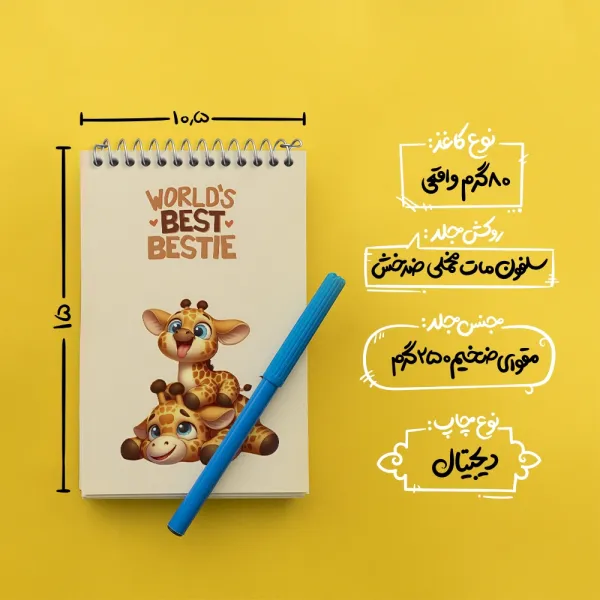 برند خندالو در زمینه تولید انواع دفاتر فانتزی و تحصیلی فعالیت میکند که به دلیل جذابیت ظاهری و طرح های متنوع طرفداران زیادی دارد. دفتر یادداشت خندالو طرح زرافه های بامزه محصولی مناسب برای همه عاشقان لوازم التحریر است و همچنین همه کسانی که بنا به موقعیت تحصیل یا شغلشان با دفتر و نوشت افزار زیاد سر و کار دارند. در تولید دفتر یادداشت خندالو طرح زرافه های بامزه از نوع صحافی فنر مارپیچ استفاده شده که در این نوع صحافی برگهها به راحتی چرخیده و یا بیرون آورده می شوند. دفتر های خندالو دارای جلد انعطاف پذیر از جنس مقوای گلاسه 250 گرم با روکش سلفون مات مخملی است که به شما امکان میدهد از دفتر خود بدون اینکه نگرانی از شکستن یا خراب شدن جلد را داشته باشید استفاده کنید و همچنین در این دفاتر از کاغذ 80 گرم با کیفیت استفاده شده که باعث میشود هنگام نوشتن به خوبی جوهر قلم بر روی صفحه نشسته و از خط خوردگیها جلوگیری کند. دفتر یادداشت خندالو با جنس و دوام مناسب، برگه های کاملاً سفید و خطوط طوسی دقیق را داراست که انسان را به نوشتن منظم و زیبا ترغیب میکند. طراحی کاملاً مناسب این دفاتر، به همراه کیفیت بالا، از آن یک محصول مورد علاقه و قابل اعتماد برای همه مقاطع تحصیلی میسازد. دفتر یادداشت خندالو طرح زرافه های بامزه انتخابی هوشمندانه و مناسب برای افرادی است که به دنبال دفتری با کیفیت و کاربرد عالی هستند. این دفتر، همراه خوبی برای شما در تمام مراحل تحصیل و کار خواهد بود و تجربهای لذتبخش از نوشتن و آموختن را به شما هدیه میدهد.