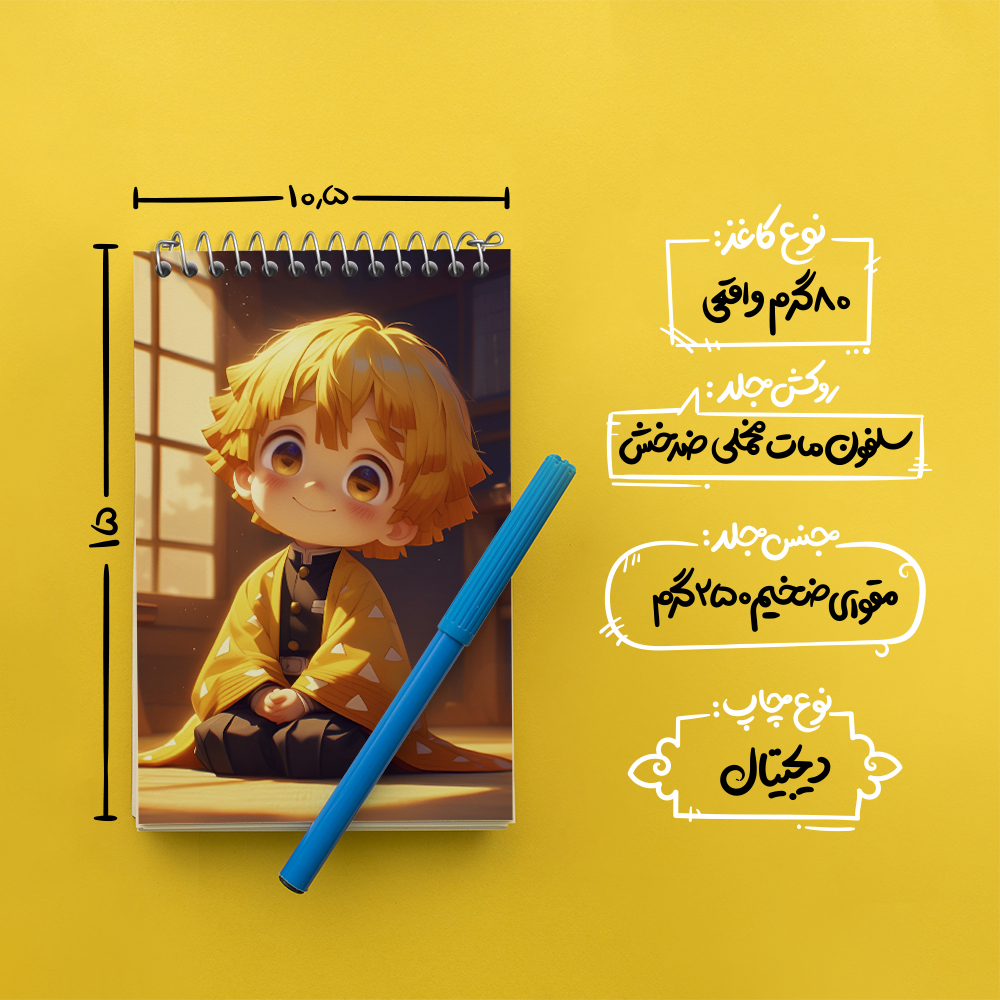 برند خندالو در زمینه تولید انواع دفاتر فانتزی و تحصیلی فعالیت میکند که به دلیل جذابیت ظاهری و طرح های متنوع طرفداران زیادی دارد. دفتر یادداشت خندالو طرح زنیتسو انیمه شیطان کش محصولی مناسب برای همه عاشقان لوازم التحریر است و همچنین همه کسانی که بنا به موقعیت تحصیل یا شغلشان با دفتر و نوشت افزار زیاد سر و کار دارند. در تولید دفتر یادداشت خندالو طرح زنیتسو انیمه شیطان کش از نوع صحافی فنر مارپیچ استفاده شده که در این نوع صحافی برگه‌ها به راحتی چرخیده و یا بیرون آورده می شوند.