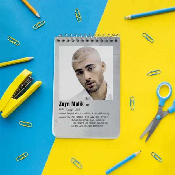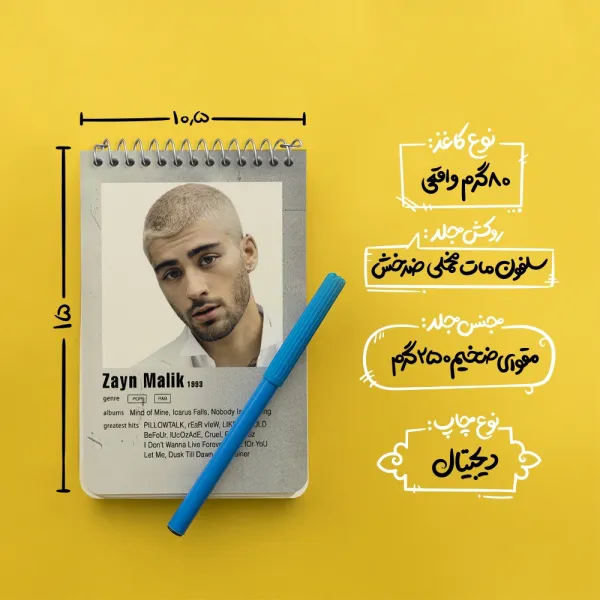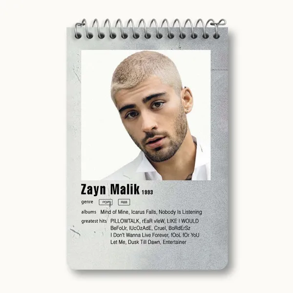 برند خندالو در زمینه تولید انواع دفاتر فانتزی و تحصیلی فعالیت میکند که به دلیل جذابیت ظاهری و طرح های متنوع طرفداران زیادی دارد. دفتر یادداشت خندالو طرح زین ملک (Zayn Malik) محصولی مناسب برای همه عاشقان لوازم التحریر است و همچنین همه کسانی که بنا به موقعیت تحصیل یا شغلشان با دفتر و نوشت افزار زیاد سر و کار دارند. در تولید دفتر یادداشت خندالو طرح زین ملک (Zayn Malik) از نوع صحافی فنر مارپیچ استفاده شده که در این نوع صحافی برگه‌ها به راحتی چرخیده و یا بیرون آورده می شوند.