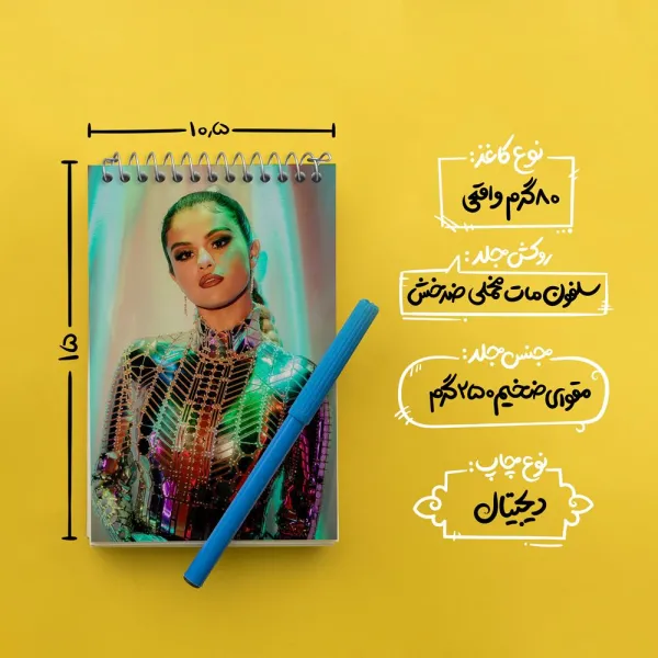 برند خندالو در زمینه تولید انواع دفاتر فانتزی و تحصیلی فعالیت میکند که به دلیل جذابیت ظاهری و طرح های متنوع طرفداران زیادی دارد. دفتر یادداشت خندالو طرح سلنا گومز Selena Gomez محصولی مناسب برای همه عاشقان لوازم التحریر است و همچنین همه کسانی که بنا به موقعیت تحصیل یا شغلشان با دفتر و نوشت افزار زیاد سر و کار دارند. در تولید دفتر یادداشت خندالو طرح سلنا گومز Selena Gomez از نوع صحافی فنر مارپیچ استفاده شده که در این نوع صحافی برگه‌ها به راحتی چرخیده و یا بیرون آورده می شوند.