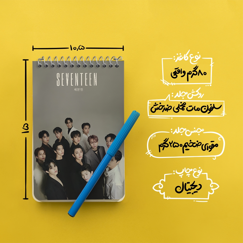 برند خندالو در زمینه تولید انواع دفاتر فانتزی و تحصیلی فعالیت میکند که به دلیل جذابیت ظاهری و طرح های متنوع طرفداران زیادی دارد. دفتر یادداشت خندالو طرح سونتین (Seventeen) محصولی مناسب برای همه عاشقان لوازم التحریر است و همچنین همه کسانی که بنا به موقعیت تحصیل یا شغلشان با دفتر و نوشت افزار زیاد سر و کار دارند. در تولید دفتر یادداشت خندالو طرح سونتین (Seventeen) از نوع صحافی فنر مارپیچ استفاده شده که در این نوع صحافی برگه‌ها به راحتی چرخیده و یا بیرون آورده می شوند.