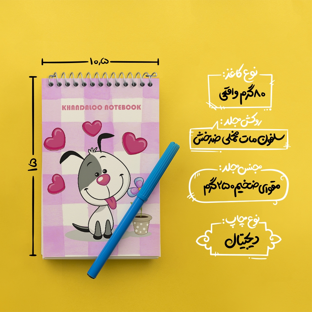 برند خندالو در زمینه تولید انواع دفاتر فانتزی و تحصیلی فعالیت میکند که به دلیل جذابیت ظاهری و طرح های متنوع طرفداران زیادی دارد. دفتر یادداشت خندالو طرح سگ بامزه محصولی مناسب برای همه عاشقان لوازم التحریر است و همچنین همه کسانی که بنا به موقعیت تحصیل یا شغلشان با دفتر و نوشت افزار زیاد سر و کار دارند. در تولید دفتر یادداشت خندالو طرح سگ بامزه از نوع صحافی فنر مارپیچ استفاده شده که در این نوع صحافی برگه‌ها به راحتی چرخیده و یا بیرون آورده می شوند.