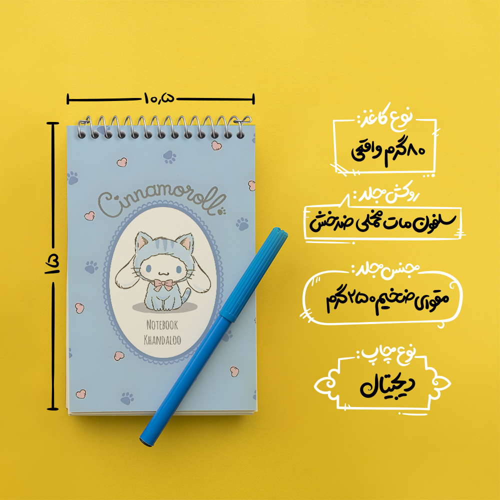 برند خندالو در زمینه تولید انواع دفاتر فانتزی و تحصیلی فعالیت میکند که به دلیل جذابیت ظاهری و طرح های متنوع طرفداران زیادی دارد. دفتر یادداشت خندالو طرح سینامونرول هلو کیتی محصولی مناسب برای همه عاشقان لوازم التحریر است و همچنین همه کسانی که بنا به موقعیت تحصیل یا شغلشان با دفتر و نوشت افزار زیاد سر و کار دارند. در تولید دفتر یادداشت خندالو طرح سینامونرول هلو کیتی از نوع صحافی فنر مارپیچ استفاده شده که در این نوع صحافی برگه‌ها به راحتی چرخیده و یا بیرون آورده می شوند.