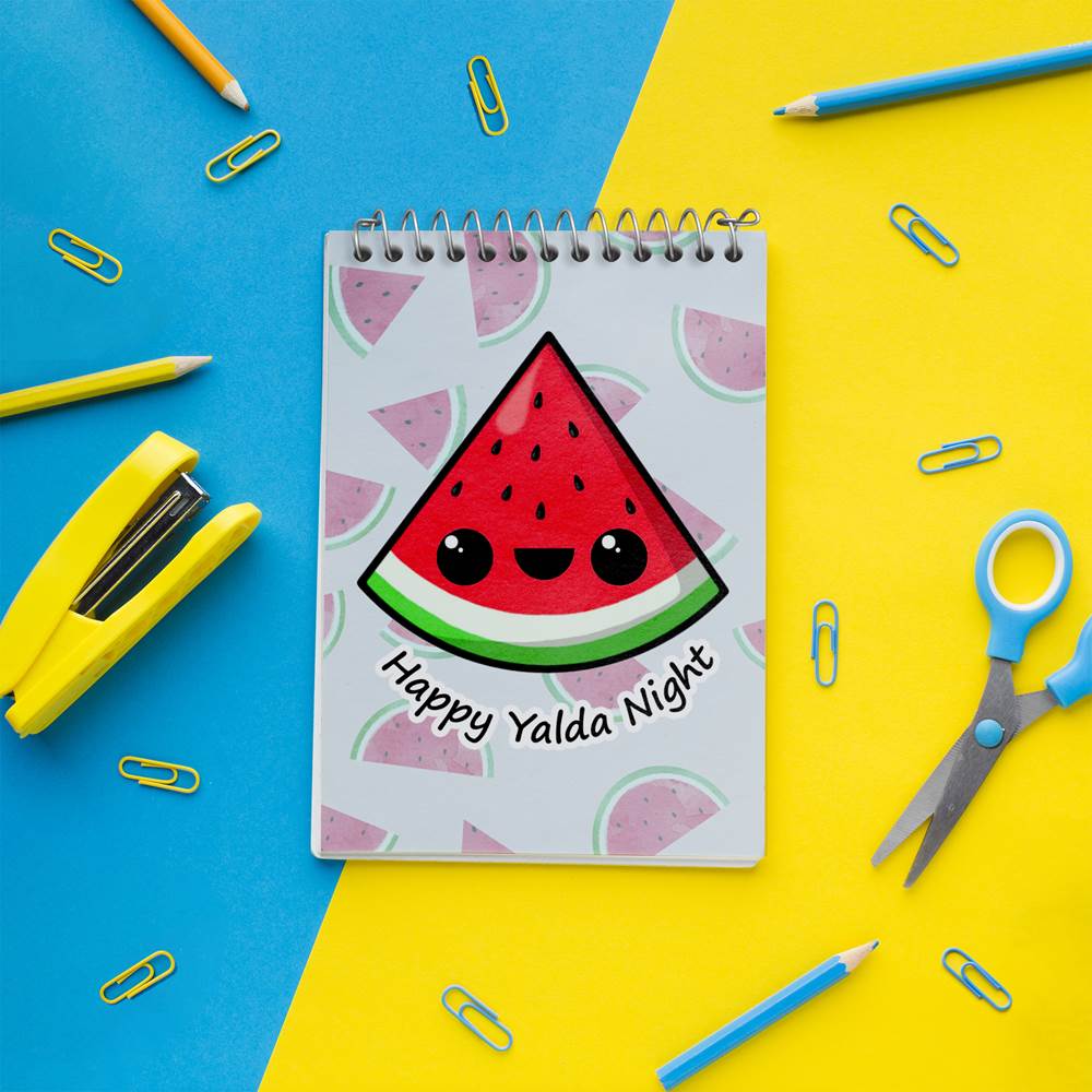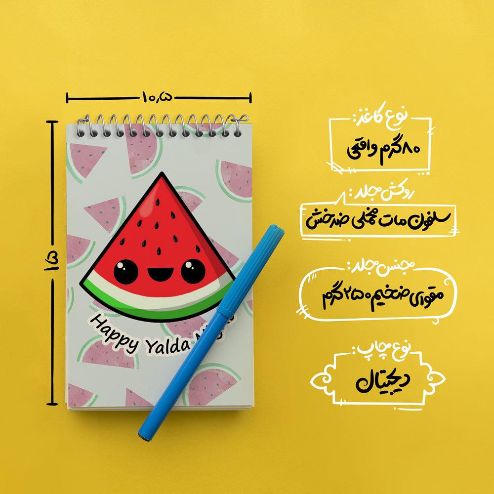 برند خندالو در زمینه تولید انواع دفاتر فانتزی و تحصیلی فعالیت میکند که به دلیل جذابیت ظاهری و طرح های متنوع طرفداران زیادی دارد. دفتر یادداشت خندالو طرح شب یلدا محصولی مناسب برای همه عاشقان لوازم التحریر است و همچنین همه کسانی که بنا به موقعیت تحصیل یا شغلشان با دفتر و نوشت افزار زیاد سر و کار دارند. در تولید دفتر یادداشت خندالو طرح شب یلدا از نوع صحافی فنر مارپیچ استفاده شده که در این نوع صحافی برگه‌ها به راحتی چرخیده و یا بیرون آورده می شوند.