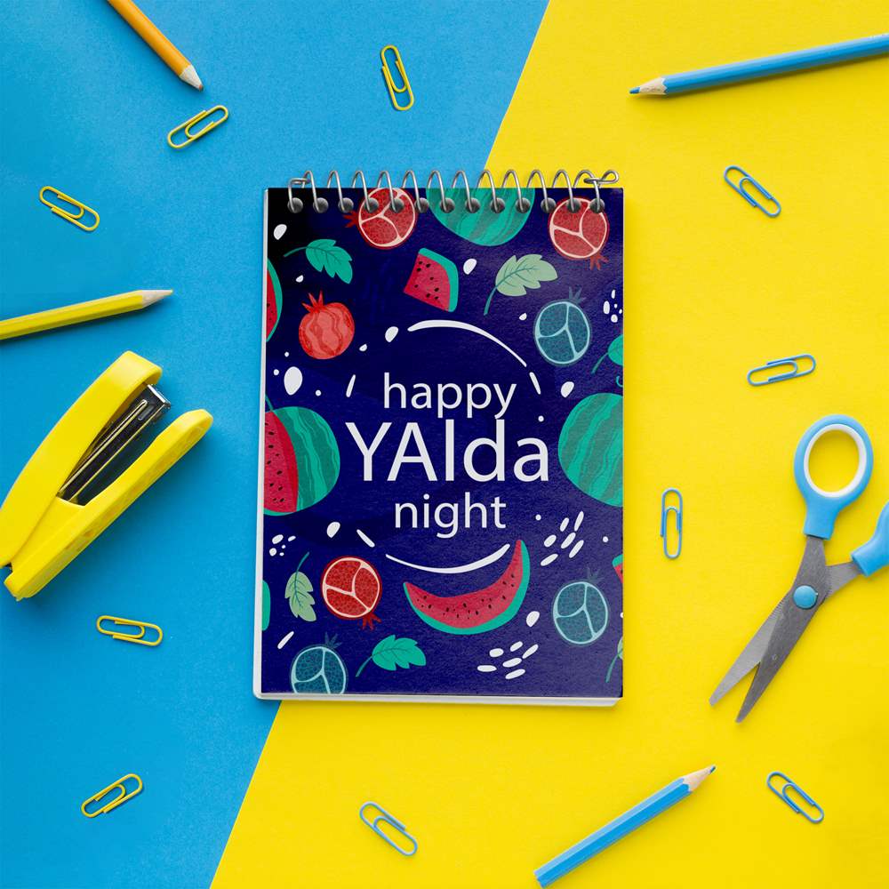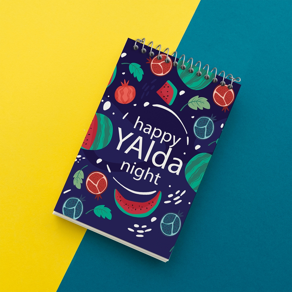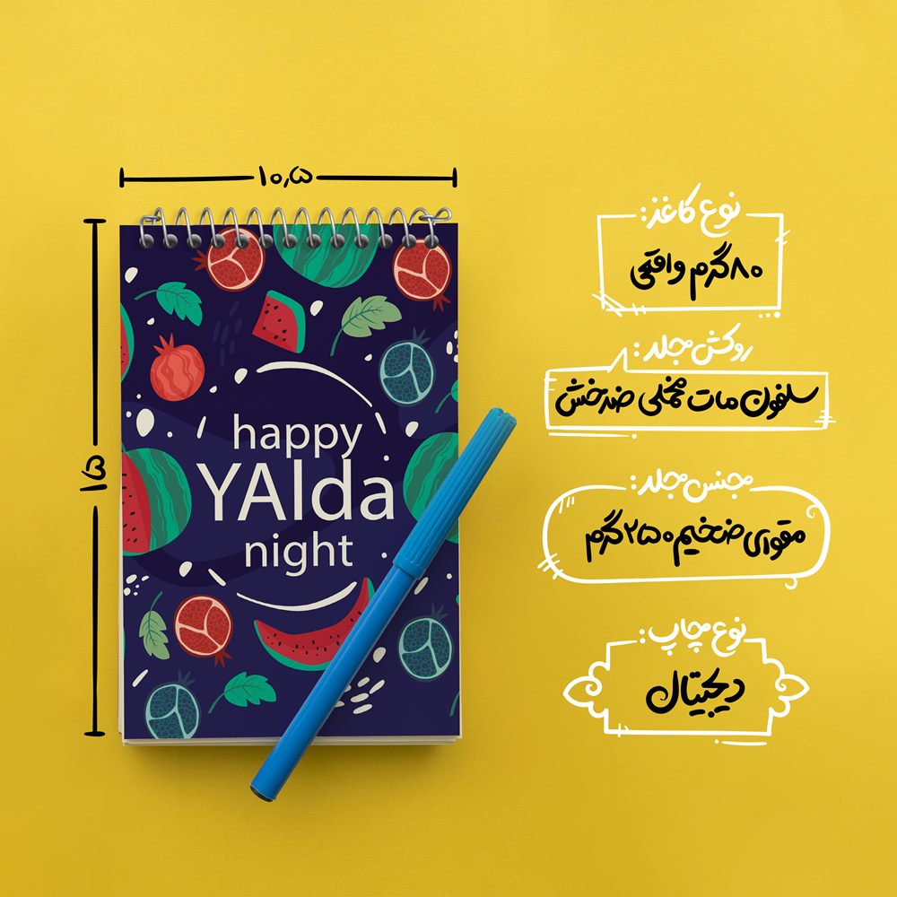 برند خندالو در زمینه تولید انواع دفاتر فانتزی و تحصیلی فعالیت میکند که به دلیل جذابیت ظاهری و طرح های متنوع طرفداران زیادی دارد. دفتر یادداشت خندالو طرح شب یلدا محصولی مناسب برای همه عاشقان لوازم التحریر است و همچنین همه کسانی که بنا به موقعیت تحصیل یا شغلشان با دفتر و نوشت افزار زیاد سر و کار دارند. در تولید دفتر یادداشت خندالو طرح شب یلدا از نوع صحافی فنر مارپیچ استفاده شده که در این نوع صحافی برگه‌ها به راحتی چرخیده و یا بیرون آورده می شوند.