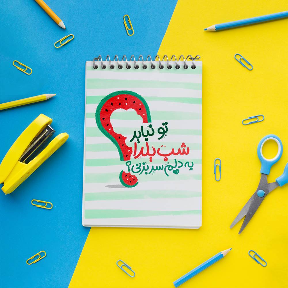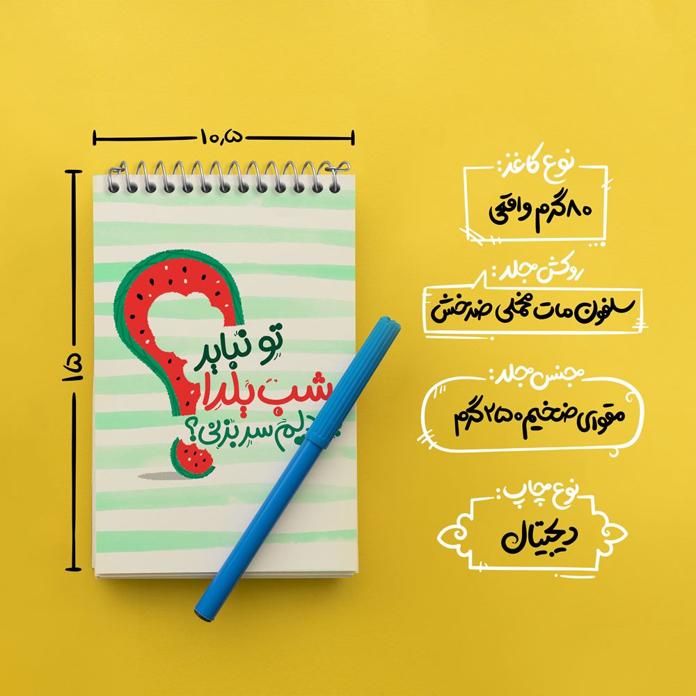 برند خندالو در زمینه تولید انواع دفاتر فانتزی و تحصیلی فعالیت میکند که به دلیل جذابیت ظاهری و طرح های متنوع طرفداران زیادی دارد. دفتر یادداشت خندالو طرح شب یلدا محصولی مناسب برای همه عاشقان لوازم التحریر است و همچنین همه کسانی که بنا به موقعیت تحصیل یا شغلشان با دفتر و نوشت افزار زیاد سر و کار دارند. در تولید دفتر یادداشت خندالو طرح شب یلدا از نوع صحافی فنر مارپیچ استفاده شده که در این نوع صحافی برگه‌ها به راحتی چرخیده و یا بیرون آورده می شوند.