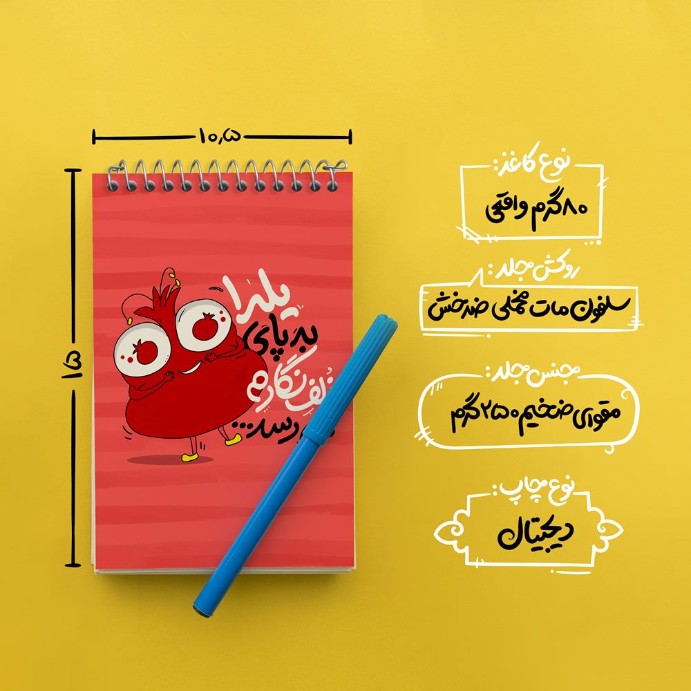 برند خندالو در زمینه تولید انواع دفاتر فانتزی و تحصیلی فعالیت میکند که به دلیل جذابیت ظاهری و طرح های متنوع طرفداران زیادی دارد. دفتر یادداشت خندالو طرح شب یلدا محصولی مناسب برای همه عاشقان لوازم التحریر است و همچنین همه کسانی که بنا به موقعیت تحصیل یا شغلشان با دفتر و نوشت افزار زیاد سر و کار دارند. در تولید دفتر یادداشت خندالو طرح شب یلدا از نوع صحافی فنر مارپیچ استفاده شده که در این نوع صحافی برگه‌ها به راحتی چرخیده و یا بیرون آورده می شوند.