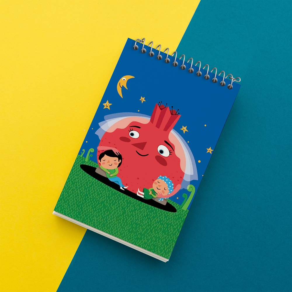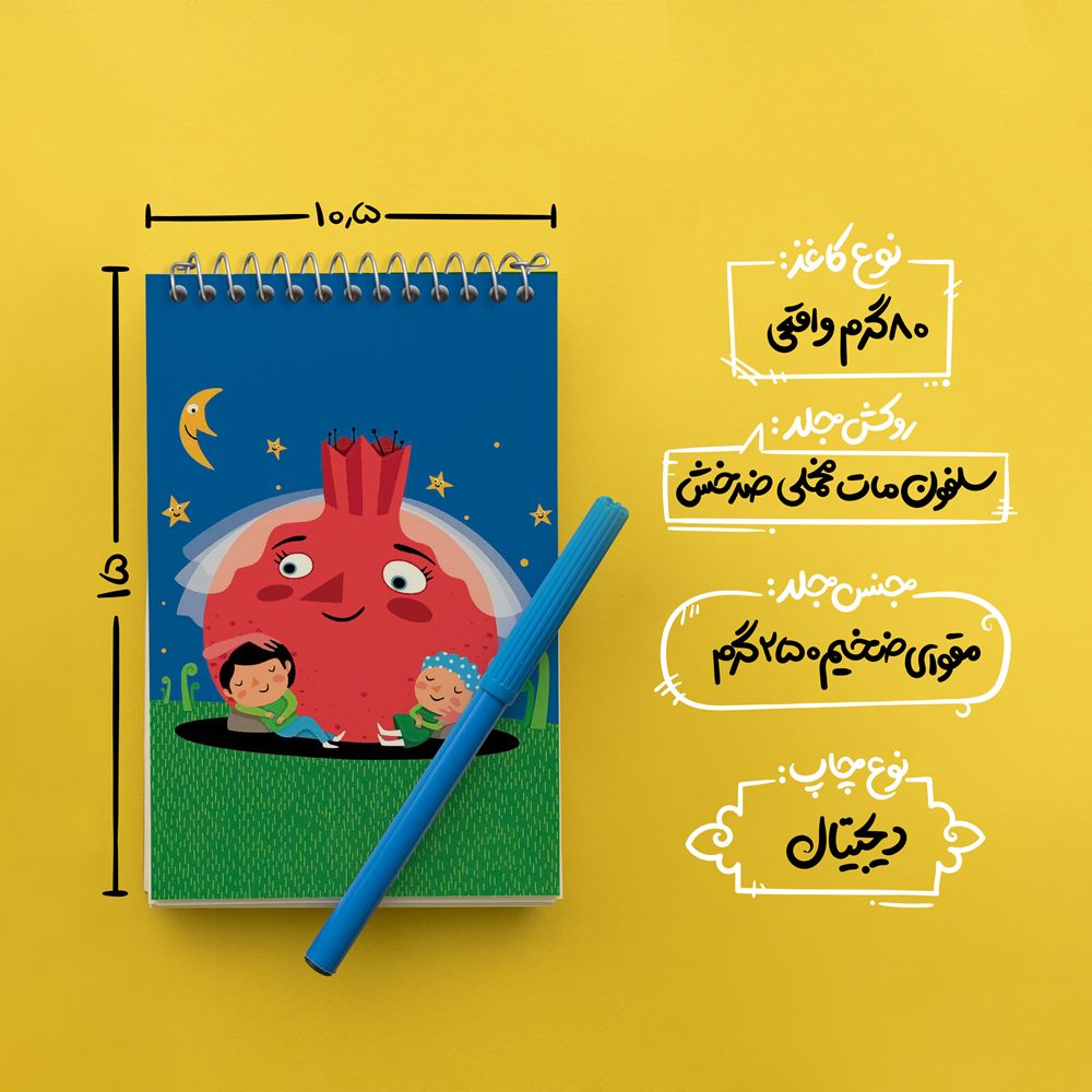 برند خندالو در زمینه تولید انواع دفاتر فانتزی و تحصیلی فعالیت میکند که به دلیل جذابیت ظاهری و طرح های متنوع طرفداران زیادی دارد. دفتر یادداشت خندالو طرح شب یلدا محصولی مناسب برای همه عاشقان لوازم التحریر است و همچنین همه کسانی که بنا به موقعیت تحصیل یا شغلشان با دفتر و نوشت افزار زیاد سر و کار دارند. در تولید دفتر یادداشت خندالو طرح شب یلدا از نوع صحافی فنر مارپیچ استفاده شده که در این نوع صحافی برگه‌ها به راحتی چرخیده و یا بیرون آورده می شوند.