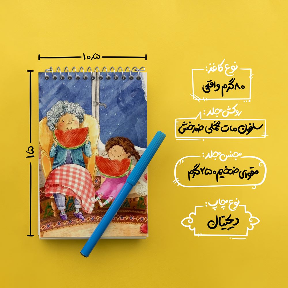 برند خندالو در زمینه تولید انواع دفاتر فانتزی و تحصیلی فعالیت میکند که به دلیل جذابیت ظاهری و طرح های متنوع طرفداران زیادی دارد. دفتر یادداشت خندالو طرح شب یلدا محصولی مناسب برای همه عاشقان لوازم التحریر است و همچنین همه کسانی که بنا به موقعیت تحصیل یا شغلشان با دفتر و نوشت افزار زیاد سر و کار دارند. در تولید دفتر یادداشت خندالو طرح شب یلدا از نوع صحافی فنر مارپیچ استفاده شده که در این نوع صحافی برگه‌ها به راحتی چرخیده و یا بیرون آورده می شوند.
