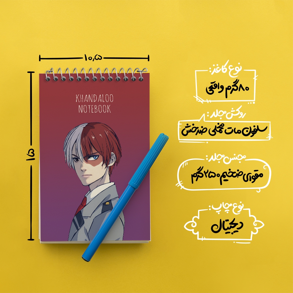 برند خندالو در زمینه تولید انواع دفاتر فانتزی و تحصیلی فعالیت میکند که به دلیل جذابیت ظاهری و طرح های متنوع طرفداران زیادی دارد. دفتر یادداشت خندالو طرح شوتو تودوروکی آکادمی قهرمان من محصولی مناسب برای همه عاشقان لوازم التحریر است و همچنین همه کسانی که بنا به موقعیت تحصیل یا شغلشان با دفتر و نوشت افزار زیاد سر و کار دارند. در تولید دفتر یادداشت خندالو طرح شوتو تودوروکی آکادمی قهرمان من از نوع صحافی فنر مارپیچ استفاده شده که در این نوع صحافی برگهها به راحتی چرخیده و یا بیرون آورده می شوند. دفتر های خندالو دارای جلد انعطاف پذیر از جنس مقوای گلاسه 250 گرم با روکش سلفون مات مخملی است که به شما امکان میدهد از دفتر خود بدون اینکه نگرانی از شکستن یا خراب شدن جلد را داشته باشید استفاده کنید و همچنین در این دفاتر از کاغذ 80 گرم با کیفیت استفاده شده که باعث میشود هنگام نوشتن به خوبی جوهر قلم بر روی صفحه نشسته و از خط خوردگیها جلوگیری کند. دفتر یادداشت خندالو با جنس و دوام مناسب، برگه های کاملاً سفید و خطوط طوسی دقیق را داراست که انسان را به نوشتن منظم و زیبا ترغیب میکند. طراحی کاملاً مناسب این دفاتر، به همراه کیفیت بالا، از آن یک محصول مورد علاقه و قابل اعتماد برای همه مقاطع تحصیلی میسازد. دفتر یادداشت خندالو طرح شوتو تودوروکی آکادمی قهرمان من انتخابی هوشمندانه و مناسب برای افرادی است که به دنبال دفتری با کیفیت و کاربرد عالی هستند. این دفتر، همراه خوبی برای شما در تمام مراحل تحصیل و کار خواهد بود و تجربهای لذتبخش از نوشتن و آموختن را به شما هدیه میدهد.