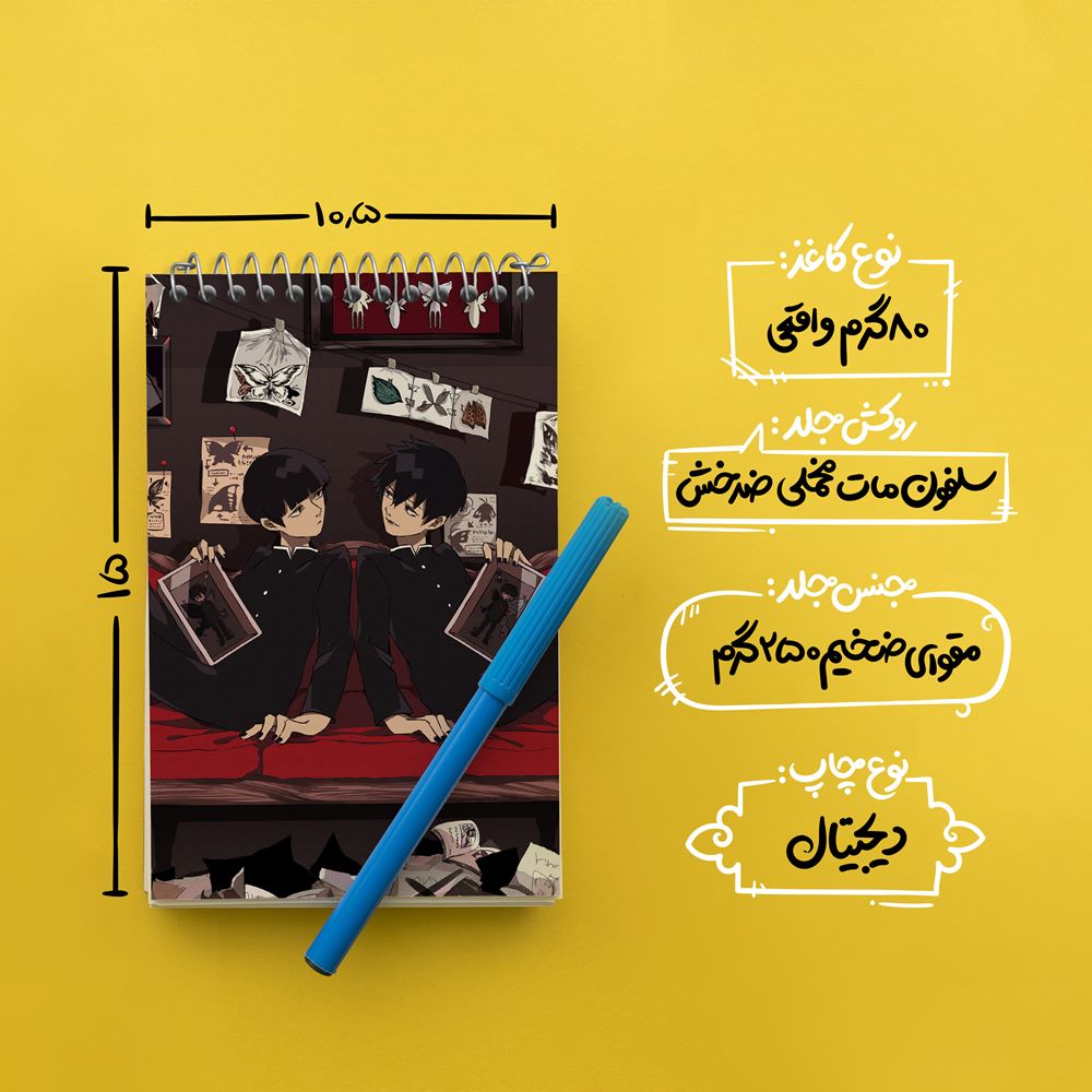 برند خندالو در زمینه تولید انواع دفاتر فانتزی و تحصیلی فعالیت میکند که به دلیل جذابیت ظاهری و طرح های متنوع طرفداران زیادی دارد. دفتر یادداشت خندالو طرح شییکو انیمه موب سایکو Mob Psycho 100 محصولی مناسب برای همه عاشقان لوازم التحریر است و همچنین همه کسانی که بنا به موقعیت تحصیل یا شغلشان با دفتر و نوشت افزار زیاد سر و کار دارند. در تولید دفتر یادداشت خندالو طرح شییکو انیمه موب سایکو Mob Psycho 100 از نوع صحافی فنر مارپیچ استفاده شده که در این نوع صحافی برگه‌ها به راحتی چرخیده و یا بیرون آورده می شوند.