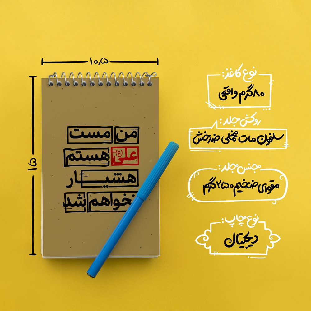 برند خندالو در زمینه تولید انواع دفاتر فانتزی و تحصیلی فعالیت میکند که به دلیل جذابیت ظاهری و طرح های متنوع طرفداران زیادی دارد. دفتر یادداشت خندالو طرح عید غدیر محصولی مناسب برای همه عاشقان لوازم التحریر است و همچنین همه کسانی که بنا به موقعیت تحصیل یا شغلشان با دفتر و نوشت افزار زیاد سر و کار دارند. در تولید دفتر یادداشت خندالو طرح عید غدیر از نوع صحافی فنر مارپیچ استفاده شده که در این نوع صحافی برگه‌ها به راحتی چرخیده و یا بیرون آورده می شوند.