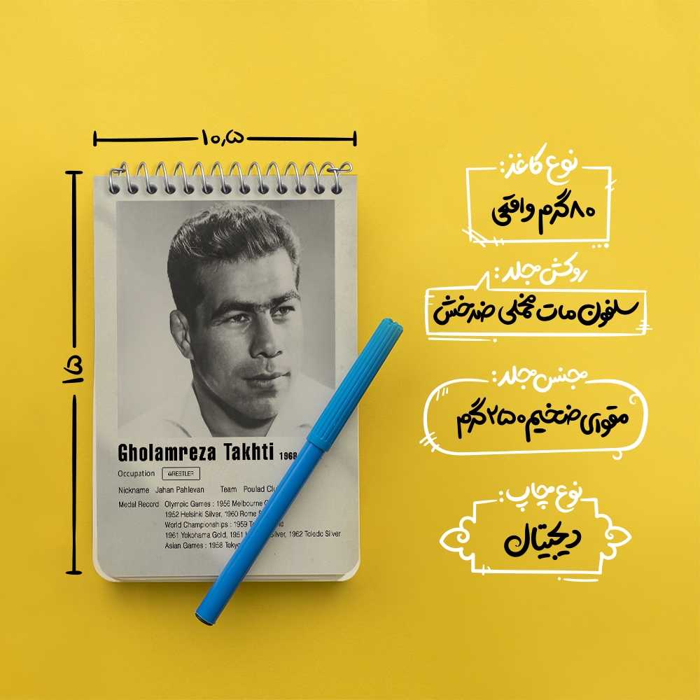 برند خندالو در زمینه تولید انواع دفاتر فانتزی و تحصیلی فعالیت میکند که به دلیل جذابیت ظاهری و طرح های متنوع طرفداران زیادی دارد. دفتر یادداشت خندالو طرح غلامرضا تختی (Gholamreza Takhti) محصولی مناسب برای همه عاشقان لوازم التحریر است و همچنین همه کسانی که بنا به موقعیت تحصیل یا شغلشان با دفتر و نوشت افزار زیاد سر و کار دارند. در تولید دفتر یادداشت خندالو طرح غلامرضا تختی (Gholamreza Takhti) از نوع صحافی فنر مارپیچ استفاده شده که در این نوع صحافی برگهها به راحتی چرخیده و یا بیرون آورده می شوند. دفتر های خندالو دارای جلد انعطاف پذیر از جنس مقوای گلاسه 250 گرم با روکش سلفون مات مخملی است که به شما امکان میدهد از دفتر خود بدون اینکه نگرانی از شکستن یا خراب شدن جلد را داشته باشید استفاده کنید و همچنین در این دفاتر از کاغذ 80 گرم با کیفیت استفاده شده که باعث میشود هنگام نوشتن به خوبی جوهر قلم بر روی صفحه نشسته و از خط خوردگیها جلوگیری کند. دفتر یادداشت خندالو با جنس و دوام مناسب، برگه های کاملاً سفید و خطوط طوسی دقیق را داراست که انسان را به نوشتن منظم و زیبا ترغیب میکند. طراحی کاملاً مناسب این دفاتر، به همراه کیفیت بالا، از آن یک محصول مورد علاقه و قابل اعتماد برای همه مقاطع تحصیلی میسازد. دفتر یادداشت خندالو طرح غلامرضا تختی (Gholamreza Takhti) انتخابی هوشمندانه و مناسب برای افرادی است که به دنبال دفتری با کیفیت و کاربرد عالی هستند. این دفتر، همراه خوبی برای شما در تمام مراحل تحصیل و کار خواهد بود و تجربهای لذتبخش از نوشتن و آموختن را به شما هدیه میدهد.