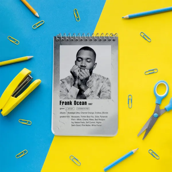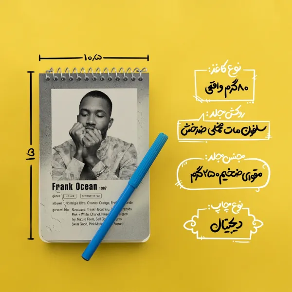 برند خندالو در زمینه تولید انواع دفاتر فانتزی و تحصیلی فعالیت میکند که به دلیل جذابیت ظاهری و طرح های متنوع طرفداران زیادی دارد. دفتر یادداشت خندالو طرح فرانک اوشن (Frank Ocean) محصولی مناسب برای همه عاشقان لوازم التحریر است و همچنین همه کسانی که بنا به موقعیت تحصیل یا شغلشان با دفتر و نوشت افزار زیاد سر و کار دارند. در تولید دفتر یادداشت خندالو طرح فرانک اوشن (Frank Ocean) از نوع صحافی فنر مارپیچ استفاده شده که در این نوع صحافی برگهها به راحتی چرخیده و یا بیرون آورده می شوند. دفتر های خندالو دارای جلد انعطاف پذیر از جنس مقوای گلاسه 250 گرم با روکش سلفون مات مخملی است که به شما امکان میدهد از دفتر خود بدون اینکه نگرانی از شکستن یا خراب شدن جلد را داشته باشید استفاده کنید و همچنین در این دفاتر از کاغذ 80 گرم با کیفیت استفاده شده که باعث میشود هنگام نوشتن به خوبی جوهر قلم بر روی صفحه نشسته و از خط خوردگیها جلوگیری کند. دفتر یادداشت خندالو با جنس و دوام مناسب، برگه های کاملاً سفید و خطوط طوسی دقیق را داراست که انسان را به نوشتن منظم و زیبا ترغیب میکند. طراحی کاملاً مناسب این دفاتر، به همراه کیفیت بالا، از آن یک محصول مورد علاقه و قابل اعتماد برای همه مقاطع تحصیلی میسازد. دفتر یادداشت خندالو طرح فرانک اوشن (Frank Ocean) انتخابی هوشمندانه و مناسب برای افرادی است که به دنبال دفتری با کیفیت و کاربرد عالی هستند. این دفتر، همراه خوبی برای شما در تمام مراحل تحصیل و کار خواهد بود و تجربهای لذتبخش از نوشتن و آموختن را به شما هدیه میدهد.