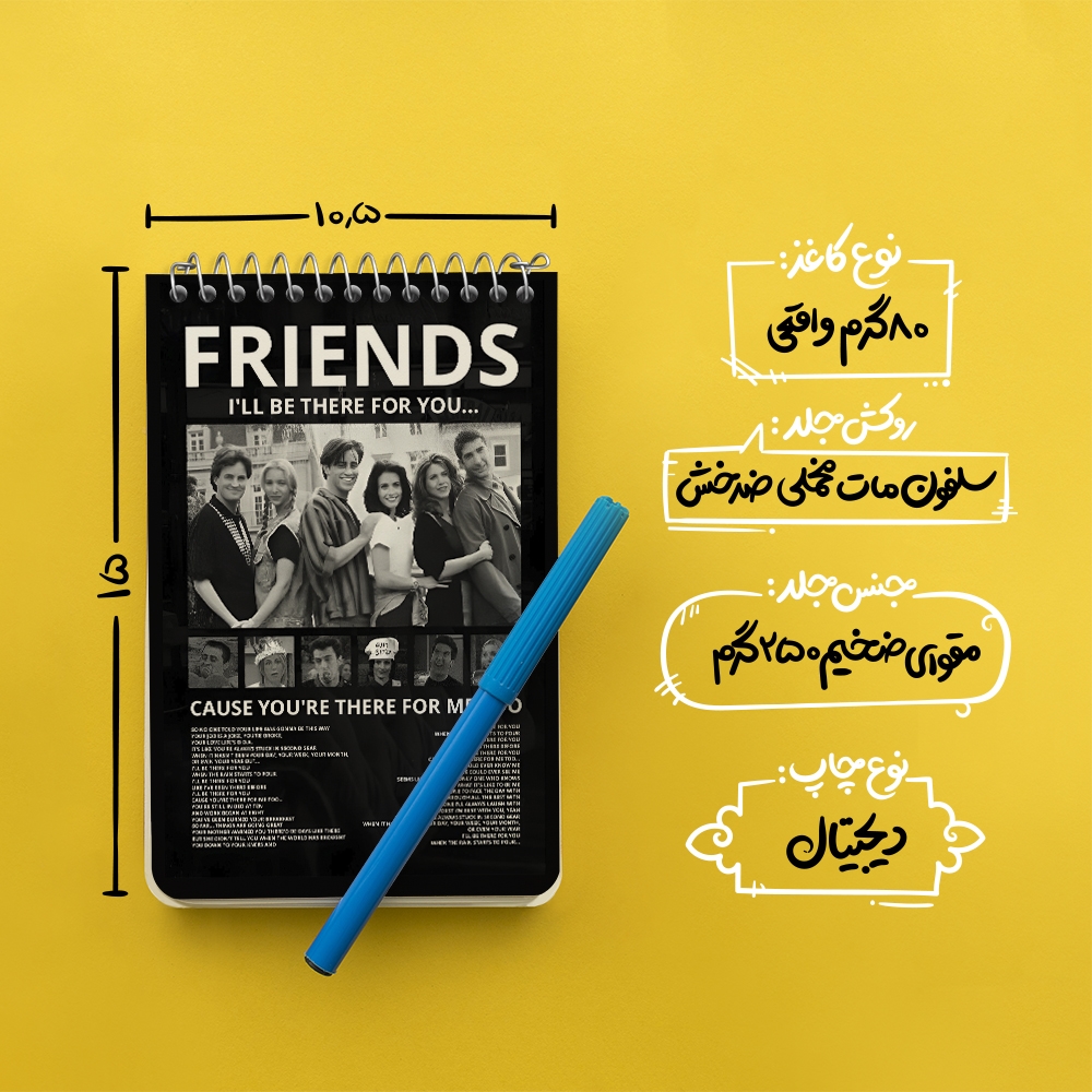 برند خندالو در زمینه تولید انواع دفاتر فانتزی و تحصیلی فعالیت میکند که به دلیل جذابیت ظاهری و طرح های متنوع طرفداران زیادی دارد. دفتر یادداشت خندالو طرح فرندز (Friends) محصولی مناسب برای همه عاشقان لوازم التحریر است و همچنین همه کسانی که بنا به موقعیت تحصیل یا شغلشان با دفتر و نوشت افزار زیاد سر و کار دارند. در تولید دفتر یادداشت خندالو طرح فرندز (Friends) از نوع صحافی فنر مارپیچ استفاده شده که در این نوع صحافی برگه‌ها به راحتی چرخیده و یا بیرون آورده می شوند.