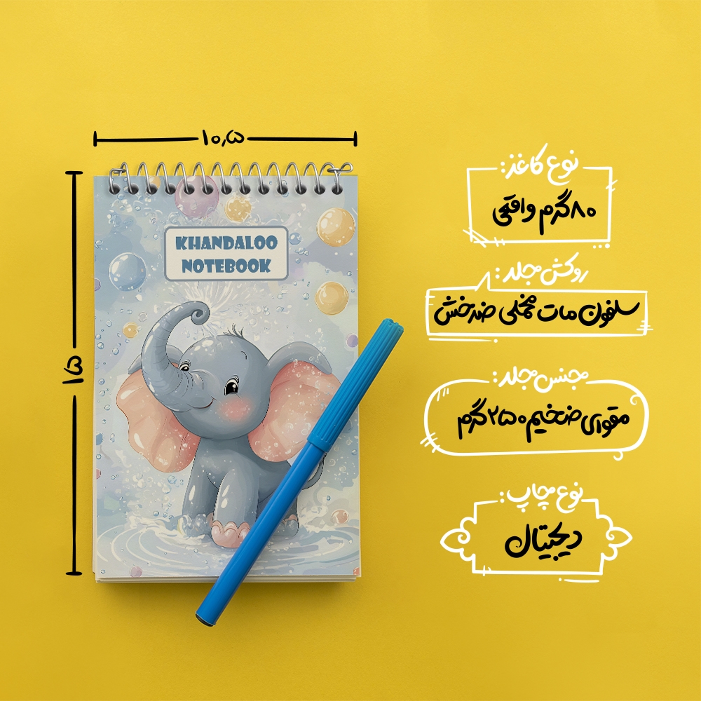 برند خندالو در زمینه تولید انواع دفاتر فانتزی و تحصیلی فعالیت میکند که به دلیل جذابیت ظاهری و طرح های متنوع طرفداران زیادی دارد. دفتر یادداشت خندالو طرح فیل کوچولو محصولی مناسب برای همه عاشقان لوازم التحریر است و همچنین همه کسانی که بنا به موقعیت تحصیل یا شغلشان با دفتر و نوشت افزار زیاد سر و کار دارند. در تولید دفتر یادداشت خندالو طرح فیل کوچولو از نوع صحافی فنر مارپیچ استفاده شده که در این نوع صحافی برگه‌ها به راحتی چرخیده و یا بیرون آورده می شوند.