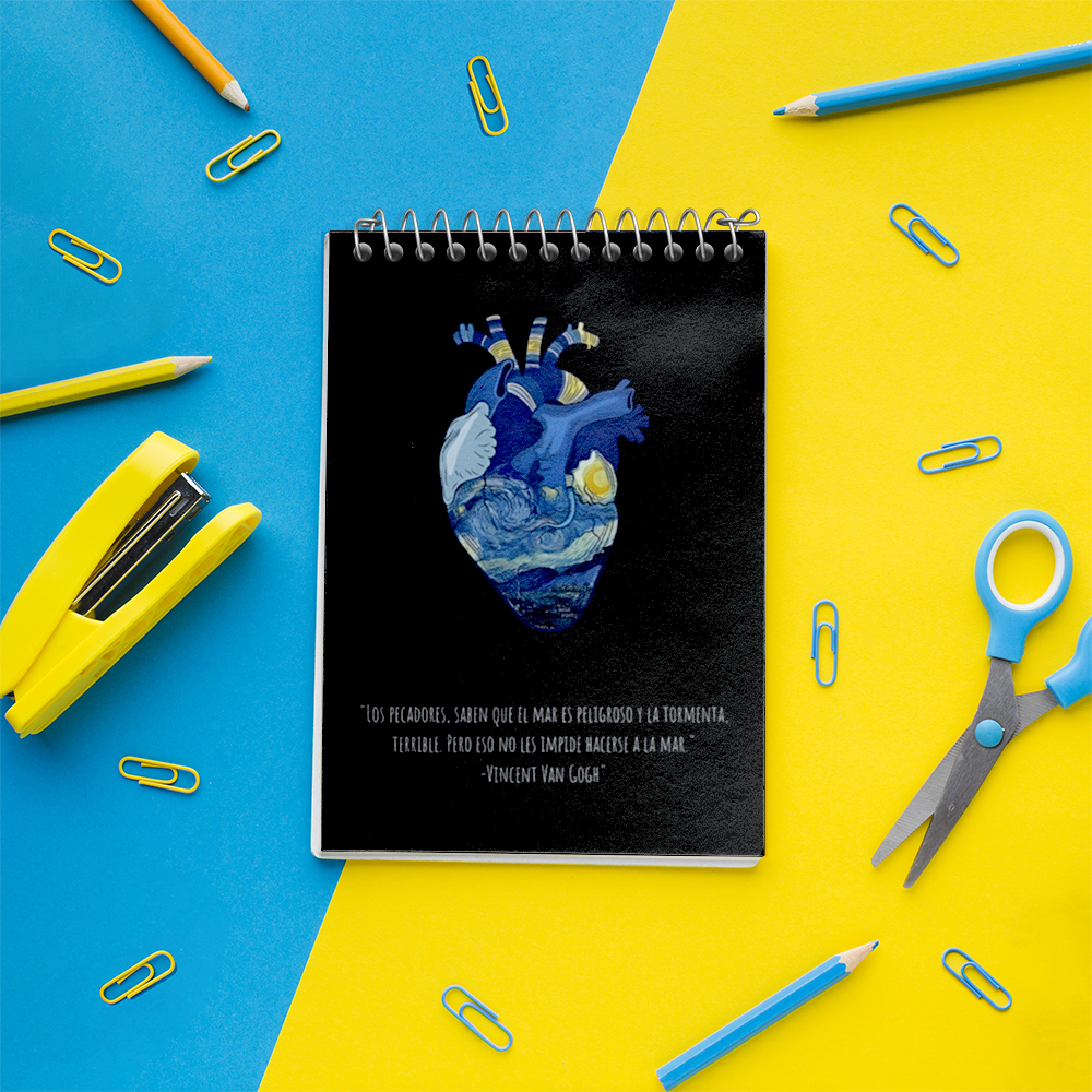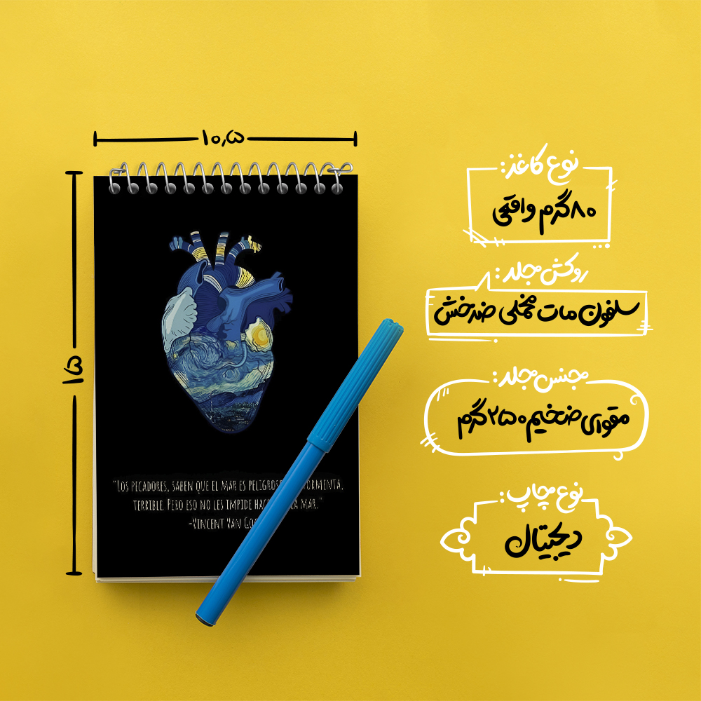 برند خندالو در زمینه تولید انواع دفاتر فانتزی و تحصیلی فعالیت میکند که به دلیل جذابیت ظاهری و طرح های متنوع طرفداران زیادی دارد. دفتر یادداشت خندالو طرح قلب ونسان ونگوگ محصولی مناسب برای همه عاشقان لوازم التحریر است و همچنین همه کسانی که بنا به موقعیت تحصیل یا شغلشان با دفتر و نوشت افزار زیاد سر و کار دارند. در تولید دفتر یادداشت خندالو طرح قلب ونسان ونگوگ از نوع صحافی فنر مارپیچ استفاده شده که در این نوع صحافی برگه‌ها به راحتی چرخیده و یا بیرون آورده می شوند.
