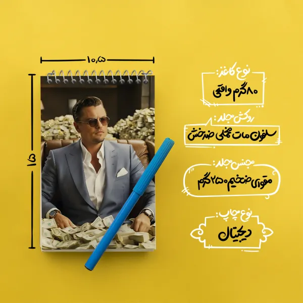 برند خندالو در زمینه تولید انواع دفاتر فانتزی و تحصیلی فعالیت میکند که به دلیل جذابیت ظاهری و طرح های متنوع طرفداران زیادی دارد. دفتر یادداشت خندالو طرح لئوناردو دیکاپریو (Leonardo DiCaprio) محصولی مناسب برای همه عاشقان لوازم التحریر است و همچنین همه کسانی که بنا به موقعیت تحصیل یا شغلشان با دفتر و نوشت افزار زیاد سر و کار دارند. در تولید دفتر یادداشت خندالو طرح لئوناردو دیکاپریو (Leonardo DiCaprio) از نوع صحافی فنر مارپیچ استفاده شده که در این نوع صحافی برگهها به راحتی چرخیده و یا بیرون آورده می شوند. دفتر های خندالو دارای جلد انعطاف پذیر از جنس مقوای گلاسه 250 گرم با روکش سلفون مات مخملی است که به شما امکان میدهد از دفتر خود بدون اینکه نگرانی از شکستن یا خراب شدن جلد را داشته باشید استفاده کنید و همچنین در این دفاتر از کاغذ 80 گرم با کیفیت استفاده شده که باعث میشود هنگام نوشتن به خوبی جوهر قلم بر روی صفحه نشسته و از خط خوردگیها جلوگیری کند. دفتر یادداشت خندالو با جنس و دوام مناسب، برگه های کاملاً سفید و خطوط طوسی دقیق را داراست که انسان را به نوشتن منظم و زیبا ترغیب میکند. طراحی کاملاً مناسب این دفاتر، به همراه کیفیت بالا، از آن یک محصول مورد علاقه و قابل اعتماد برای همه مقاطع تحصیلی میسازد. دفتر یادداشت خندالو طرح لئوناردو دیکاپریو (Leonardo DiCaprio) انتخابی هوشمندانه و مناسب برای افرادی است که به دنبال دفتری با کیفیت و کاربرد عالی هستند. این دفتر، همراه خوبی برای شما در تمام مراحل تحصیل و کار خواهد بود و تجربهای لذتبخش از نوشتن و آموختن را به شما هدیه میدهد.