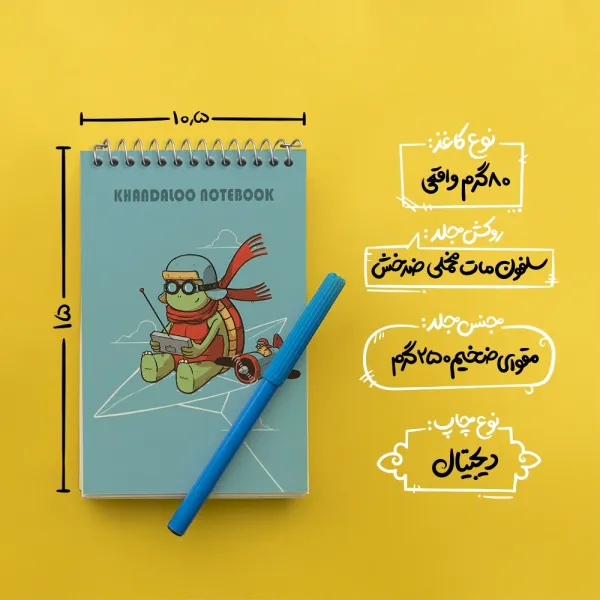 برند خندالو در زمینه تولید انواع دفاتر فانتزی و تحصیلی فعالیت میکند که به دلیل جذابیت ظاهری و طرح های متنوع طرفداران زیادی دارد. دفتر یادداشت خندالو طرح لاکپشت خلبان محصولی مناسب برای همه عاشقان لوازم التحریر است و همچنین همه کسانی که بنا به موقعیت تحصیل یا شغلشان با دفتر و نوشت افزار زیاد سر و کار دارند. در تولید دفتر یادداشت خندالو طرح لاکپشت خلبان از نوع صحافی فنر مارپیچ استفاده شده که در این نوع صحافی برگهها به راحتی چرخیده و یا بیرون آورده می شوند. دفتر های خندالو دارای جلد انعطاف پذیر از جنس مقوای گلاسه 250 گرم با روکش سلفون مات مخملی است که به شما امکان میدهد از دفتر خود بدون اینکه نگرانی از شکستن یا خراب شدن جلد را داشته باشید استفاده کنید و همچنین در این دفاتر از کاغذ 80 گرم با کیفیت استفاده شده که باعث میشود هنگام نوشتن به خوبی جوهر قلم بر روی صفحه نشسته و از خط خوردگیها جلوگیری کند. دفتر یادداشت خندالو با جنس و دوام مناسب، برگه های کاملاً سفید و خطوط طوسی دقیق را داراست که انسان را به نوشتن منظم و زیبا ترغیب میکند. طراحی کاملاً مناسب این دفاتر، به همراه کیفیت بالا، از آن یک محصول مورد علاقه و قابل اعتماد برای همه مقاطع تحصیلی میسازد. دفتر یادداشت خندالو طرح لاکپشت خلبان انتخابی هوشمندانه و مناسب برای افرادی است که به دنبال دفتری با کیفیت و کاربرد عالی هستند. این دفتر، همراه خوبی برای شما در تمام مراحل تحصیل و کار خواهد بود و تجربهای لذتبخش از نوشتن و آموختن را به شما هدیه میدهد.