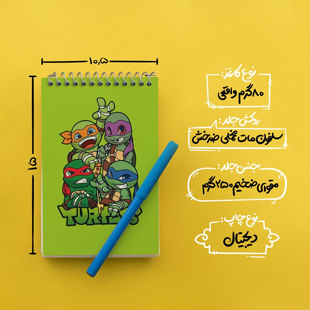 برند خندالو در زمینه تولید انواع دفاتر فانتزی و تحصیلی فعالیت میکند که به دلیل جذابیت ظاهری و طرح های متنوع طرفداران زیادی دارد. دفتر یادداشت خندالو طرح لاکپشت های نینجا محصولی مناسب برای همه عاشقان لوازم التحریر است و همچنین همه کسانی که بنا به موقعیت تحصیل یا شغلشان با دفتر و نوشت افزار زیاد سر و کار دارند. در تولید دفتر یادداشت خندالو طرح لاکپشت های نینجا از نوع صحافی فنر مارپیچ استفاده شده که در این نوع صحافی برگه‌ها به راحتی چرخیده و یا بیرون آورده می شوند.