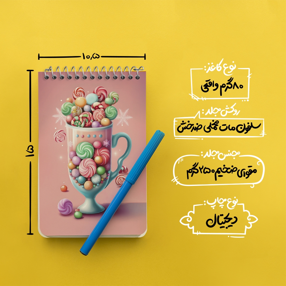 برند خندالو در زمینه تولید انواع دفاتر فانتزی و تحصیلی فعالیت میکند که به دلیل جذابیت ظاهری و طرح های متنوع طرفداران زیادی دارد. دفتر یادداشت خندالو طرح لیوان آبنبات محصولی مناسب برای همه عاشقان لوازم التحریر است و همچنین همه کسانی که بنا به موقعیت تحصیل یا شغلشان با دفتر و نوشت افزار زیاد سر و کار دارند. در تولید دفتر یادداشت خندالو طرح لیوان آبنبات از نوع صحافی فنر مارپیچ استفاده شده که در این نوع صحافی برگهها به راحتی چرخیده و یا بیرون آورده می شوند. دفتر های خندالو دارای جلد انعطاف پذیر از جنس مقوای گلاسه 250 گرم با روکش سلفون مات مخملی است که به شما امکان میدهد از دفتر خود بدون اینکه نگرانی از شکستن یا خراب شدن جلد را داشته باشید استفاده کنید و همچنین در این دفاتر از کاغذ 80 گرم با کیفیت استفاده شده که باعث میشود هنگام نوشتن به خوبی جوهر قلم بر روی صفحه نشسته و از خط خوردگیها جلوگیری کند. دفتر یادداشت خندالو با جنس و دوام مناسب، برگه های کاملاً سفید و خطوط طوسی دقیق را داراست که انسان را به نوشتن منظم و زیبا ترغیب میکند. طراحی کاملاً مناسب این دفاتر، به همراه کیفیت بالا، از آن یک محصول مورد علاقه و قابل اعتماد برای همه مقاطع تحصیلی میسازد. دفتر یادداشت خندالو طرح لیوان آبنبات انتخابی هوشمندانه و مناسب برای افرادی است که به دنبال دفتری با کیفیت و کاربرد عالی هستند. این دفتر، همراه خوبی برای شما در تمام مراحل تحصیل و کار خواهد بود و تجربهای لذتبخش از نوشتن و آموختن را به شما هدیه میدهد.