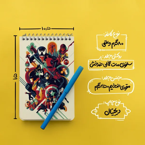 برند خندالو در زمینه تولید انواع دفاتر فانتزی و تحصیلی فعالیت میکند که به دلیل جذابیت ظاهری و طرح های متنوع طرفداران زیادی دارد. دفتر یادداشت خندالو طرح مارول (Marvel) محصولی مناسب برای همه عاشقان لوازم التحریر است و همچنین همه کسانی که بنا به موقعیت تحصیل یا شغلشان با دفتر و نوشت افزار زیاد سر و کار دارند. در تولید دفتر یادداشت خندالو طرح مارول (Marvel) از نوع صحافی فنر مارپیچ استفاده شده که در این نوع صحافی برگه‌ها به راحتی چرخیده و یا بیرون آورده می شوند.